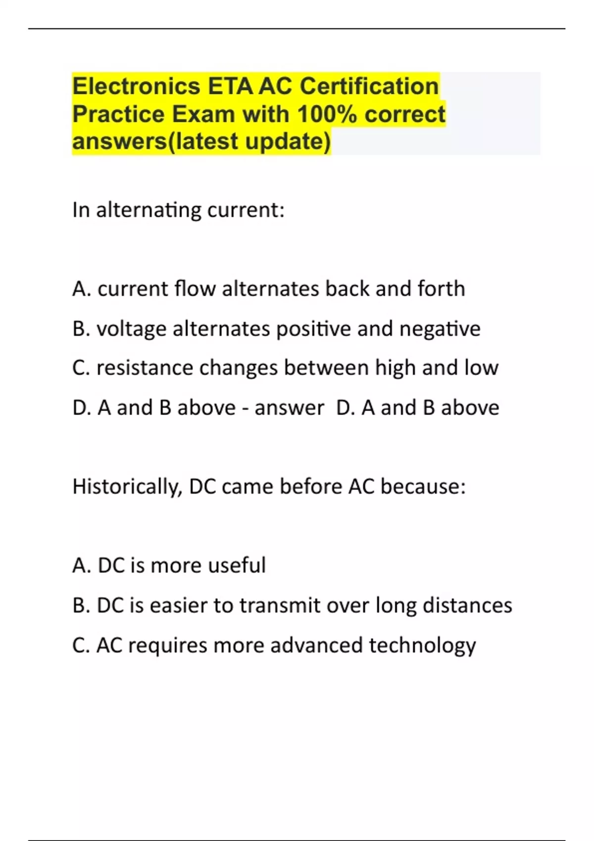 Electronics ETA AC Certification Practice Exam with 100% correct answers(latest update)
