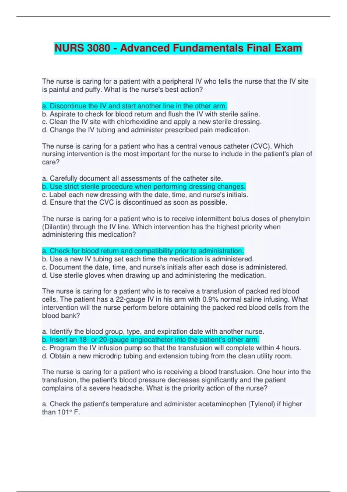 NURS 3080 - Advanced Fundamentals Final Exam - Complete Solutions (Answered) The nurse is caring for a patient with a peripheral IV who tells the nurse that the IV site is painful and puffy. What is the nurse's best action? a. Discontinue the IV and start another line in the other arm. b. Aspirate to check for blood return and flush the IV with sterile saline. c. Clean the IV site with chlorhexidine and apply a new sterile dressing. d. Change the IV tubing and administer prescribed pain medication. The nurse is caring for a patient who has a central venous catheter (CVC). Which nursing intervention is the most important for the nurse to include in the patient's plan of care? a. Carefully document all assessments of the catheter site. b. Use strict sterile procedure when performing dressing changes. c. Label each new dressing with the date, time, and nurse's initials. d. Ensure that the CVC is discontinued as soon as possible. The nurse is caring for a patient who is to receive intermittent bolus doses of phenytoin (Dilantin) through the IV line. Which intervention has the highest priority when administering this medication? a. Check for blood return and compatibility prior to administration. b. Use a new IV tubing set each time the medication is administered. c. Document the date, time, and nurse's initials after each dose is administered. d. Use sterile gloves when drawing up and administering the medication. The nurse is caring for a patient who is to receive a transfusion of packed red blood cells. The patient has a 22-gauge IV in his arm with 0.9% normal saline infusing. What intervention will the nurse perform before obtaining the packed red blood cells from the blood bank? a. Identify the blood group, type, and expiration date with another nurse. b. Insert an 18- or 20-gauge angiocatheter into the patient's other arm. c. Program the IV infusion pump so that the transfusion will complete within 4 hours. d. Obtain a new microdrip tubing and extension tubing from the clean utility room. The nurse is caring for a patient who is receiving a blood transfusion. One hour into the transfusion, the patient's blood pressure decreases significantly and the patient complains of a severe headache. What is the priority action of the nurse? a. Check the patient's temperature and administer acetaminophen (Tylenol) if higher than 101° F. b. Recheck the patient's blood pressure in 15 minutes after administering pain medication. c. Stop the blood transfusion and administer 0.9% normal saline through new IV tubing. d. Double-check that the transfusion blood type is an exact match to the patient. The nurse is caring for a patient who has B-positive blood. The patient is severely anemic and requires a blood transfusion. Which types of blood can the patient receive? (Select all that apply.) a. AB positive b. AB negative c. B negative d. B positive e. O positive f. O negative The nurse is assessing the intravenous (IV) site in the right forearm and notices the area around it is cool, swollen, firm, and tender to touch. Which complication is most likely occurring? a. Infection b. Speed shock c. Infiltration d. Phlebitis Which activity is important to include in the plan of care for a client with a peripherally inserted central catheter (PICC)? a. Use sterile technique when changing the PICC dressing. b. Change the IV tubing every 72 hours. c. Take blood pressure in the arm with the PICC line. d. Use only macrodrip tubing with IV infusions through the PICC line. The nurse has begun an infusion of fresh frozen plasma (FFP). Which symptom indicates an allergic reaction to the FFP? a. Respirations: 30/min b. Urine output: 50 mL/hr c. Heart rate: 62 beats/min d. Temperature: 39° C (102.2° F) The nurse is preparing to insert an IV catheter with an intermittent infusion device (IID) into an elderly woman for medication administration. Which of the following considerations would be incorrect? A. Insert the IV catheter into nondominant hand/arm. B. Use a 16- or 18-gauge over-the-needle catheter. C. Release the tourniquet before attaching the IID. D. Flush the IID with 2 to 3 mL normal saline after insertion. Which of the following would the nurse expect to be included in the plan of care for a patient receiving total parenteral nutrition (TPN)? A. Blood sugar levels are checked on a routine basis B. Maintaining NPO status C. Hourly urine output D. Vital signs every 4 hours Which of the following statements would be considered incorrect when transfusing packed red blood cells (RBCs)? (Select all that apply.) A. Adjust the infusion rate to ensure unit is infused within 6 hours. B. Begin an infusion of D5W prior to the packed RBCs. C. Obtain baseline vital signs, including temperature and pulse oximetry. D. Verify the patient ID and blood unit number with another nurse prior to administration. Which of the following IV solutions is considered hypertonic? A. Lactated Ringers B. D5W C. D5 0.45% NS D. 0.9% normal saline At 0900, the nurse hangs an IV of 1000 mL D5LR to infuse at 125 mL/hr. What time will the nurse need to hang a new bag of IV fluid? Provide your answer in military time: _____ hours. 1700 The nurse is caring for a patient who has a 1200 mL daily fluid restriction. The patient has consumed 250 mL with each of her three meals and had another 150 mL with her medications. The patient has received 150 mL of IV fluids during the day. How many mL of fluid may the patient still consume in order to stay within the prescribed fluid restriction? a. 100 mL b. 150 mL c. 250 mL d. 300 mL Which patient has a higher risk of impaired skin integrity using the Braden Scale? a. 6 b. 23 c. 1 d. 14 When should the braden scale be assessed on a patient? a. When they are receiving a bed change and a bath b. When they are sleeping c. When they are at physical therapy d. When they are getting their morning medications A fall risk assessment using the Morse Scale is done at least every ___________ hours. A. 6 B. 24 C. 12 D. 72 Wh