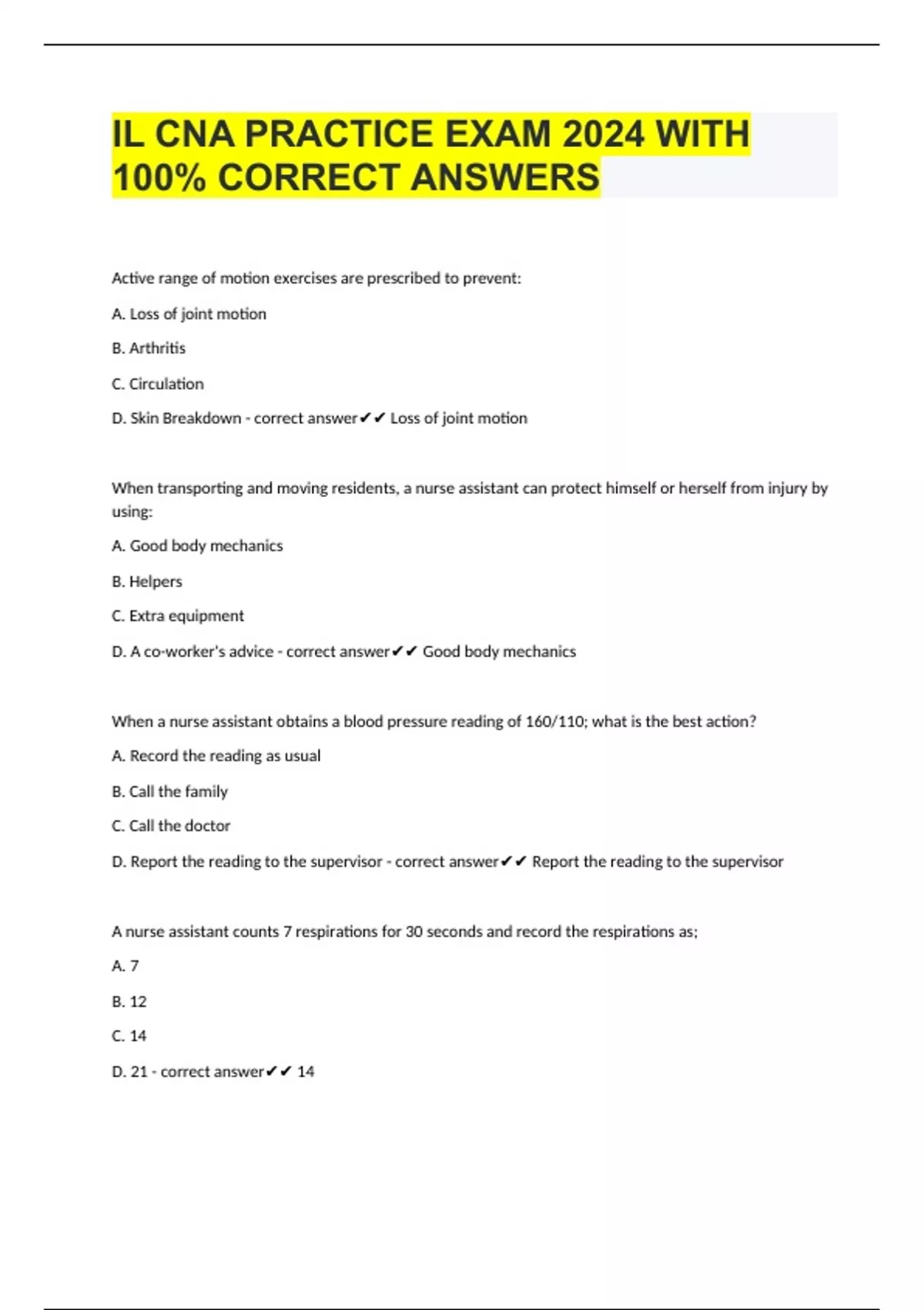 IL CNA PRACTICE EXAM 2024 WITH 100% CORRECT ANSWERS Active range of motion exercises are prescribed to prevent: A. Loss of joint motion B. Arthritis C. Circulation D. Skin Breakdown - correct answer Loss of joint motion When transporting and moving residents, a nurse assistant can protect himself or herself from injury by using: A. Good body mechanics B. Helpers C. Extra equipment D. A co-worker's advice - correct answer Good body mechanics When a nurse assistant obtains a blood pressure reading of 160/110; what is the best action? A. Record the reading as usual B. Call the family C. Call the doctor D. Report the reading to the supervisor - correct answer Report the reading to the supervisor