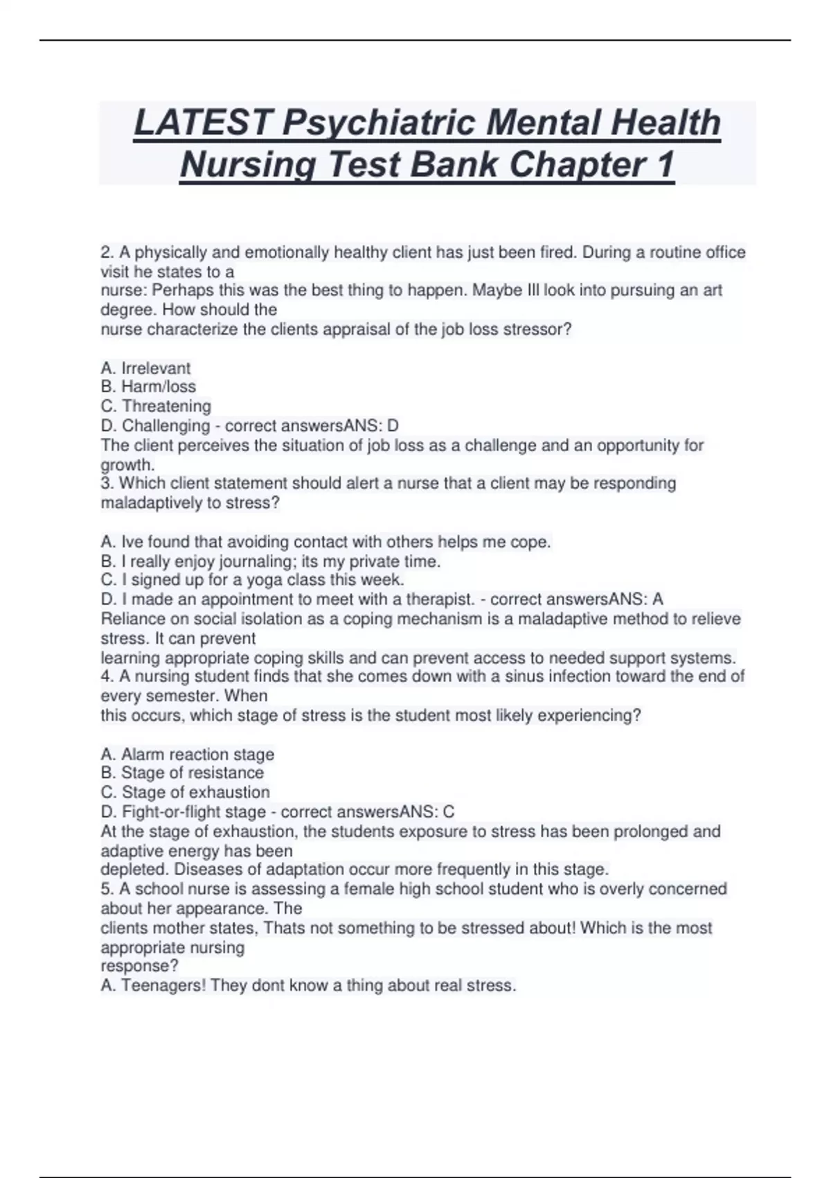 LATEST Psychiatric Mental Health Nursing Test Bank Chapter 1 2. A physically and emotionally healthy client has just been fired. During a routine office visit he states to a nurse: Perhaps this was the best thing to happen. Maybe Ill look into pursuing an art degree. How should the nurse characterize the clients appraisal of the job loss stressor? A. Irrelevant B. Harm/loss C. Threatening D. Challenging - correct answersANS: D The client perceives the situation of job loss as a challenge and an opportunity for growth. 3. Which client statement should alert a nurse that a client may be responding maladaptively to stress? A. Ive found that avoiding contact with others helps me cope. B. I really enjoy journaling; its my private time. C. I signed up for a yoga class this week. D. I made an appointment to meet with a therapist. - correct answersANS: A Reliance on social isolation as a coping mechanism is a maladaptive method to relieve stress. It can prevent learning appropriate coping skills and can prevent access to needed support systems. 4. A nursing student finds that she comes down with a sinus infection toward the end of every semester. When this occurs, which stage of stress is the student most likely experiencing? A. Alarm reaction stage B. Stage of resistance C. Stage of exhaustion D. Fight-or-flight stage - correct answersANS: C At the stage of exhaustion, the students exposure to stress has been prolonged and adaptive energy has been depleted. Diseases of adaptation occur more frequently in this stage. 5. A school nurse is assessing a female high school student who is overly concerned about her appearance. The clients mother states, Thats not something to be stressed about! Which is the most appropriate nursing response? A. Teenagers! They dont know a thing about rea