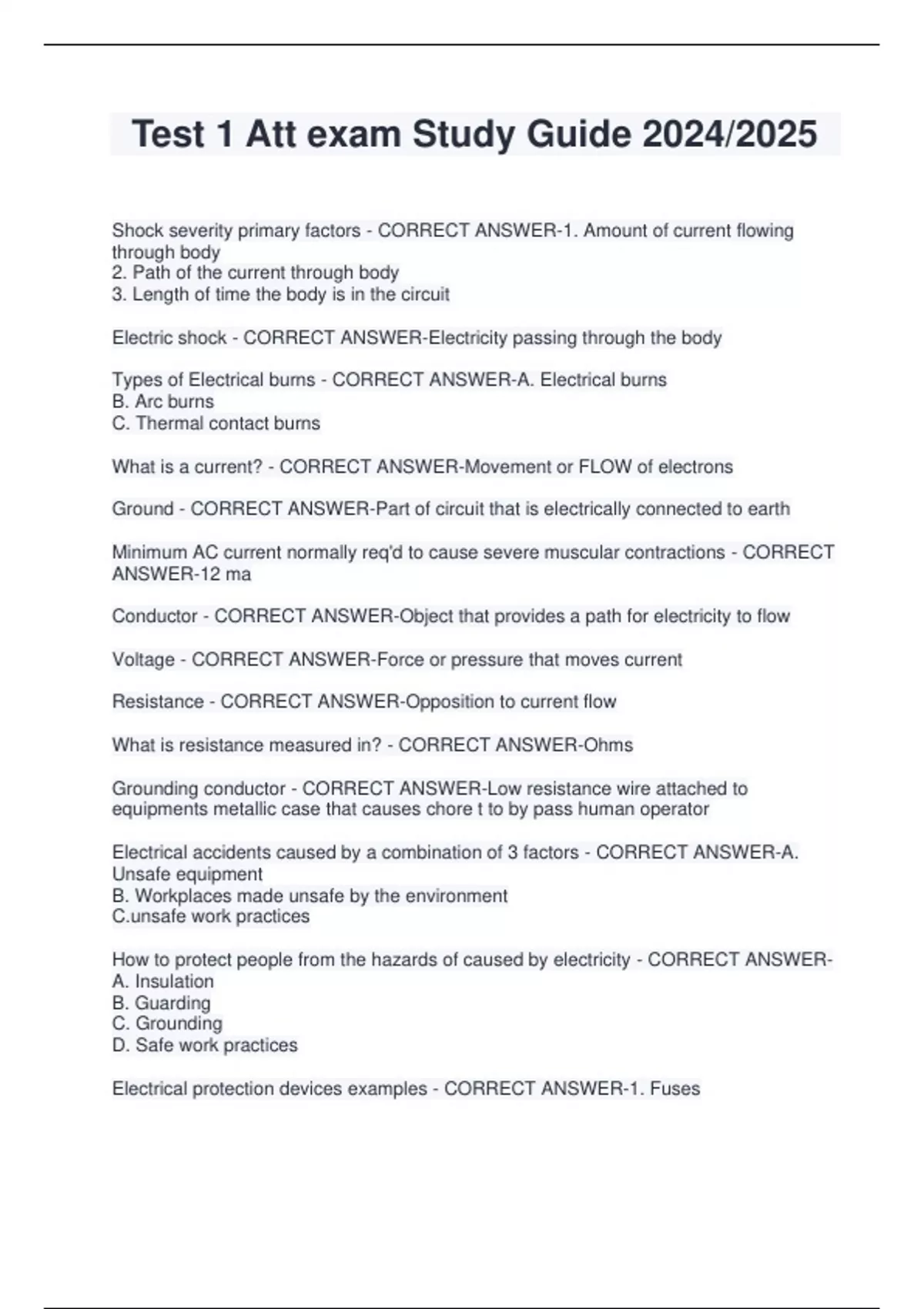 Test 1 Att exam Study Guide 2024/2025 Shock severity primary factors - CORRECT ANSWER-1. Amount of current flowing through body 2. Path of the current through body 3. Length of time the body is in the circuit Electric shock - CORRECT ANSWER-Electricity passing through the body Types of Electrical burns - CORRECT ANSWER-A. Electrical burns B. Arc burns C. Thermal contact burns What is a current? - CORRECT ANSWER-Movement or FLOW of electrons Ground - CORRECT ANSWER-Part of circuit that is electrically connected to earth Minimum AC current normally req'd to cause severe muscular contractions - CORRECT