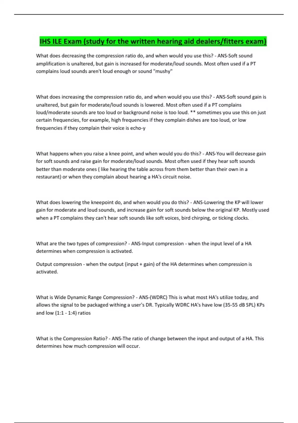 IHS ILE Exam (study for the written hearing aid dealers/fitters exam) What does decreasing the compression ratio do, and when would you use this? - ANS-Soft sound amplification is unaltered, but gain is increased for moderate/loud sounds. Most often used if a PT complains loud sounds aren't loud enough or sound "mushy" What does increasing the compression ratio do, and when would you use this? - ANS-Soft sound gain is unaltered, but gain for moderate/loud sounds is lowered. Most often used if a PT complains loud/moderate sounds are too loud or background noise is too loud. ** sometimes you use this on just certain frequencies, for example, high frequencies if they complain dishes are too loud, or low frequencies if they complain their voice is echo-y What happens when you raise a knee point, and when would you do this? - ANS-You will decrease gain for soft sounds and raise gain for moderate/loud sounds. Most often used if they hear soft sounds better than moderate ones ( like hearing the table across from them better than their own in a restaurant) or when they complain about hearing a HA's circuit noise. What does lowering the kneepoint do, and when would you do this? - ANS-Lowering the KP will lower gain for moderate and loud sounds, and increase gain for soft sounds below the original KP. Mostly used when a PT complains they can't hear soft sounds like soft voices, bird chirping, or ticking clocks. What are the two types of compression? - ANS-Input compression - when the input level of a HA determines when compression is activated. Output compression - when the output (input + gain) of the HA determines when compression is activated. What is Wide Dynamic Range Compression? - ANS-(WDRC) This is what most HA's utilize today, and allows the signal to be packaged withing a user's DR. Typically WDRC HA's have low (35-55 dB SPL) KPs and low (1:1 - 1:4) ratios What is the Compression Ratio? - ANS-The ratio of change between the input and output of a HA. This determines how much compression will occur. What is the Kneepoint? (KP) - ANS-The lowest level at which compression is applied What is Harmonic Distortion? - ANS-Harmonic distortion occurs when a single frequency is presented to the input of a hearing aid and the output contains the original frequency plus additional undesired frequencies that are harmonically related to the original frequency. ANSI uses a harmonic distortion test that measures the distortion rate at specific Hz. Frequency Response Curve - ANS-Used in ANSI testing. A gain curve is run with the input sound at 60 dB SPL to simulate conversation level. You get the frequency range calculation from this test. Reference Test Gain (RTG) - ANS-Used in ANSI testing. Input sound is set at 60 dB SPL to simulate conversation level; and then the HFA gain is adjusted to HFA-OSPL90 -77 dB. The answer is the RTG. Full On Gain (FOG)? - ANS-Used in ANSI testing. The HFA-FOG is measured and recorded w/ the input set at 50 dB SPL Maximum Output Curve ( OSPL90) - ANS-Used in ANSI testing. It's the max output of a HA. Input is set to 90 dB SPL to test. Notes the max at each tested frequency. HFA is noted from this test. What must be done to an aid before ANSI testing? - ANS-1- Occlude all vents on outside of aid 2- Set to test mode with gain full on, output at max, and bandwidth to max 3-Telecoil should be turned off and only turned back on when testing SPLITS What couplers do do you use with what instruments when ANSI testing? - ANS-HA-1 = ITE SB-1 = RIC and thin tube BTE's HA-2 = BTE What is a coupler? - ANS-A joiner for a HA that is designed off the vol of an average ear (2cc). Used to connect the HA to a testing box for ANSI tests. What is Adaptive Feedback Supression? - ANS-
