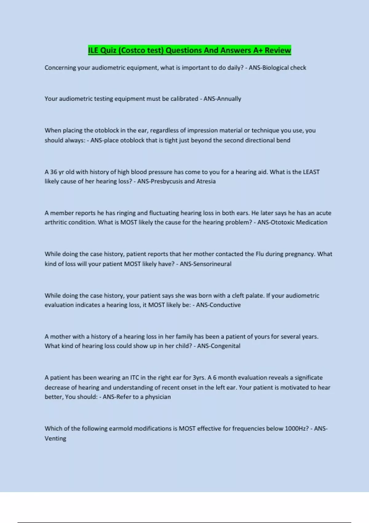 ILE Quiz (Costco test) Questions And Answers A+ Review Concerning your audiometric equipment, what is important to do daily? - ANS-Biological check Your audiometric testing equipment must be calibrated - ANS-Annually When placing the otoblock in the ear, regardless of impression material or technique you use, you should always: - ANS-place otoblock that is tight just beyond the second directional bend A 36 yr old with history of high blood pressure has come to you for a hearing aid. What is the LEAST likely cause of her hearing loss? - ANS-Presbycusis and Atresia A member reports he has ringing and fluctuating hearing loss in both ears. He later says he has an acute arthritic condition. What is MOST likely the cause for the hearing problem? - ANS-Ototoxic Medication While doing the case history, patient reports that her mother contacted the Flu during pregnancy. What kind of loss will your patient MOST likely have? - ANS-Sensorineural While doing the case history, your patient says she was born with a cleft palate. If your audiometric evaluation indicates a hearing loss, it MOST likely be: - ANS-Conductive A mother with a history of a hearing loss in her family has been a patient of yours for several years. What kind of hearing loss could show up in her child? - ANS-Congenital A patient has been wearing an ITC in the right ear for 3yrs. A 6 month evaluation reveals a significate decrease of hearing and understanding of recent onset in the left ear. Your patient is motivated to hear better, You should: - ANS-Refer to a physician Which of the following earmold modifications is MOST effective for frequencies below 1000Hz? - ANSVenting Which of the following is the LEAST recommended earmold venting technique? - ANS-Diagonal Mr. Black moved into town, worn aids 15yrs. He had a stapedectomy left ear 10yrs ago, recurrent drainage problem in right ear. He has to see you because RHA quit and wants a new one. Checking case history which is LEAST important for you to find out? - ANS-The name of the otologist that has been treating him. Continues...