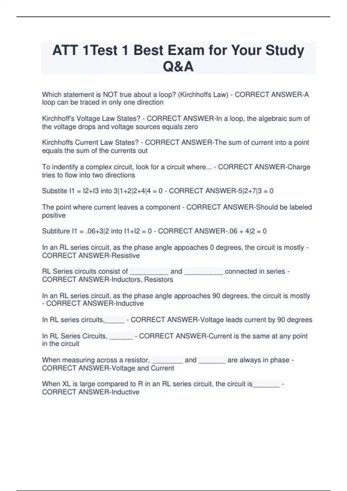 ATT 1Test 1 Best Exam for Your Study Q&A Which statement is NOT true about a loop? (Kirchhoffs Law) - CORRECT ANSWER-A loop can be traced in only one direction Kirchhoff's Voltage Law States? - CORRECT ANSWER-In a loop, the algebraic sum of the voltage drops and voltage sources equals zero Kirchhoffs Current Law States? - CORRECT ANSWER-The sum of current into a point equals the sum of the currents out To indentify a complex circuit, look for a circuit where... - CORRECT ANSWER-Charge tries to flow into two directions Substite I1 = I2+I3 into 3|1+2|2+4|4 = 0 - CORRECT ANSWER-5|2+7|3 = 0 The point where current leaves a component - CORRECT ANSWER-Should be labeled positive Subtiture I1 = .06+3|2 into I1+I2 = 0 - CORRECT ANSWER-.06 + 4|2 = 0 In an RL series circuit, as the phase angle appoaches 0 degrees, the circuit is mostly - CORRECT ANSWER-Resistive RL Series circuits consist of __________ and __________ connected in series - CORRECT ANSWER-Inductors, Resistors In an RL series circuit, as the phase angle approaches 90 degrees, the circuit is mostly - CORRECT ANSWER-Inductive In RL series circuits,_____ - CORRECT ANSWER-Voltage leads current by 90 degrees In RL Series Circuits, ______ - CORRECT ANSWER-Current is the same at any point in the circuit When measuring across a resistor, ________ and _______ are always in phase - CORRECT ANSWER-Voltage and Current When XL is large compared to R in an RL series circuit, the circuit is_______ - CORRECT ANSWER-Inductive In RL series circuits, ER and EL_________ - CORRECT ANSWER-Are at the right angl