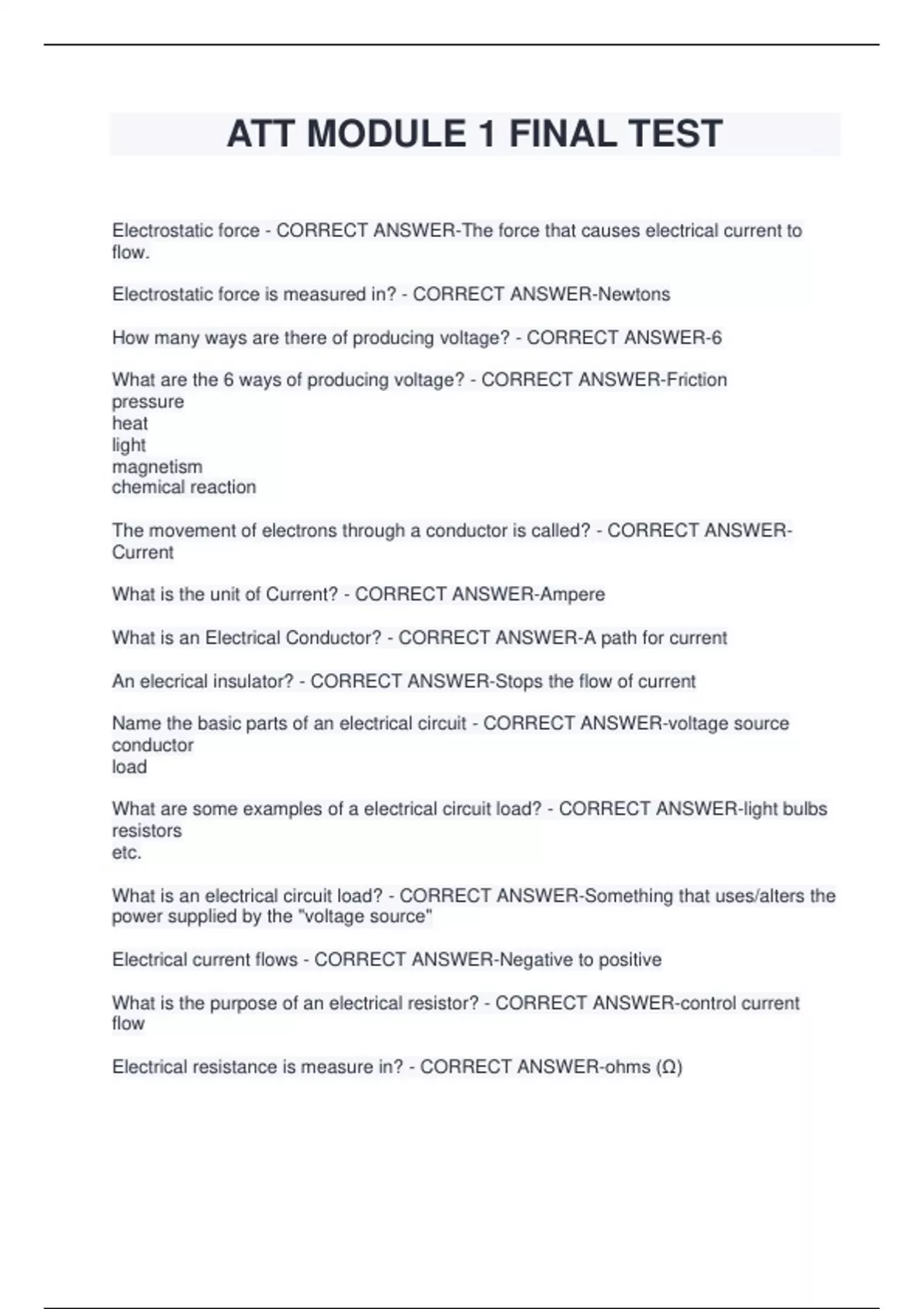 ATT MODULE 1 FINAL TEST Electrostatic force - CORRECT ANSWER-The force that causes electrical current to flow. Electrostatic force is measured in? - CORRECT ANSWER-Newtons How many ways are there of producing voltage? - CORRECT ANSWER-6 What are the 6 ways of producing voltage? - CORRECT ANSWER-Friction pressure heat light magnetism chemical reaction The movement of electron