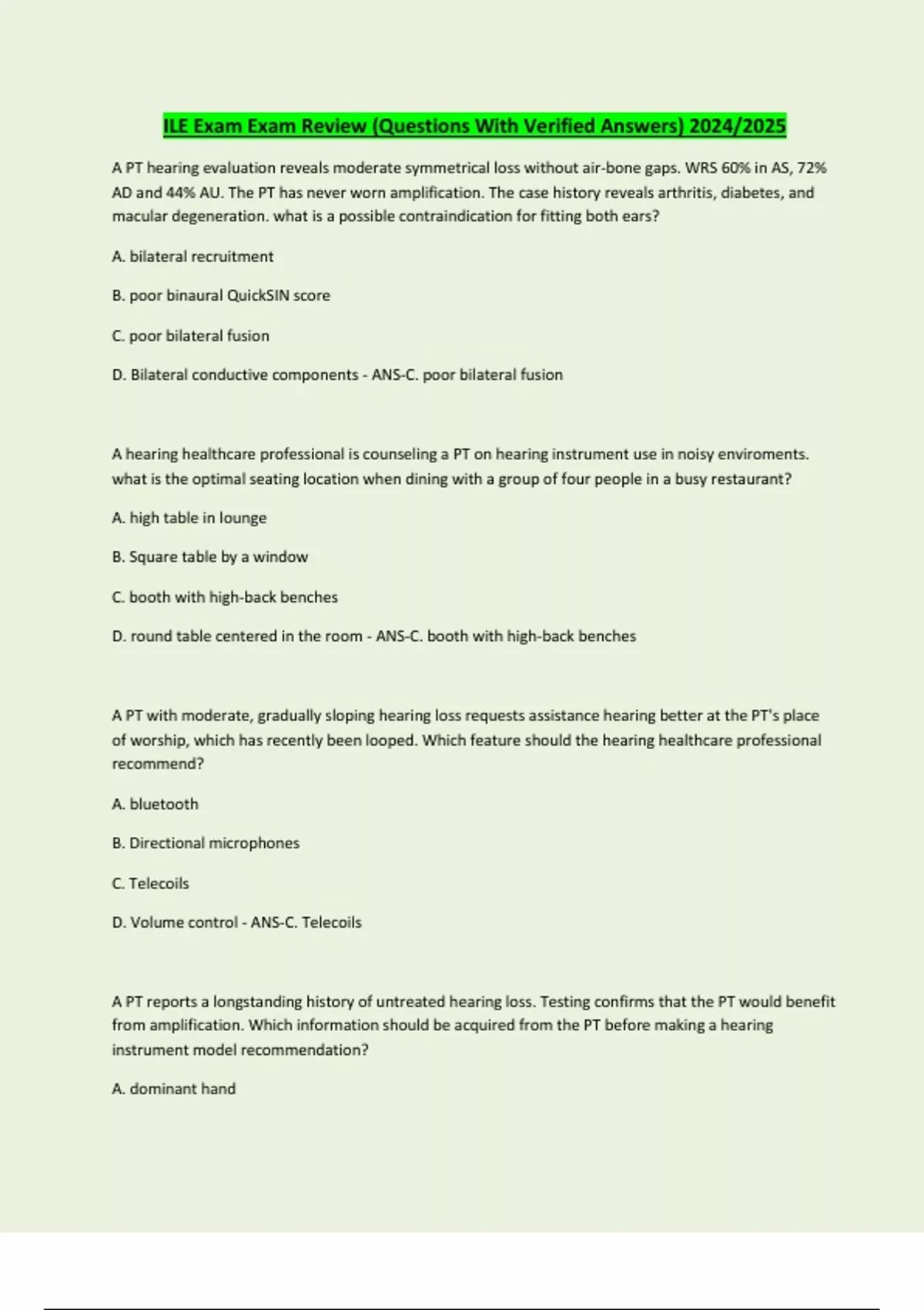 ILE Exam Exam Review (Questions With Verified Answers) 2024/2025 A PT hearing evaluation reveals moderate symmetrical loss without air-bone gaps. WRS 60% in AS, 72% AD and 44% AU. The PT has never worn amplification. The case history reveals arthritis, diabetes, and macular degeneration. what is a possible contraindication for fitting both ears? A. bilateral recruitment B. poor binaural QuickSIN score C. poor bilateral fusion D. Bilateral conductive components - ANS-C. poor bilateral fusion A hearing healthcare professional is counseling a PT on hearing instrument use in noisy enviroments. what is the optimal seating location when dining with a group of four people in a busy restaurant? A. high table in lounge B. Square table by a window C. booth with high-back benches D. round table centered in the room - ANS-C. booth with high-back benches A PT with moderate, gradually sloping hearing loss requests assistance hearing better at the PT's place of worship, which has recently been looped. Which feature should the hearing healthcare professional recommend? A. bluetooth B. Directional microphones C. Telecoils D. Volume control - ANS-C. Telecoils A PT reports a longstanding history of untreated hearing loss. Testing confirms that the PT would benefit from amplification. Which information should be acquired from the PT before making a hearing instrument model recommendation? A. dominant hand Continues...