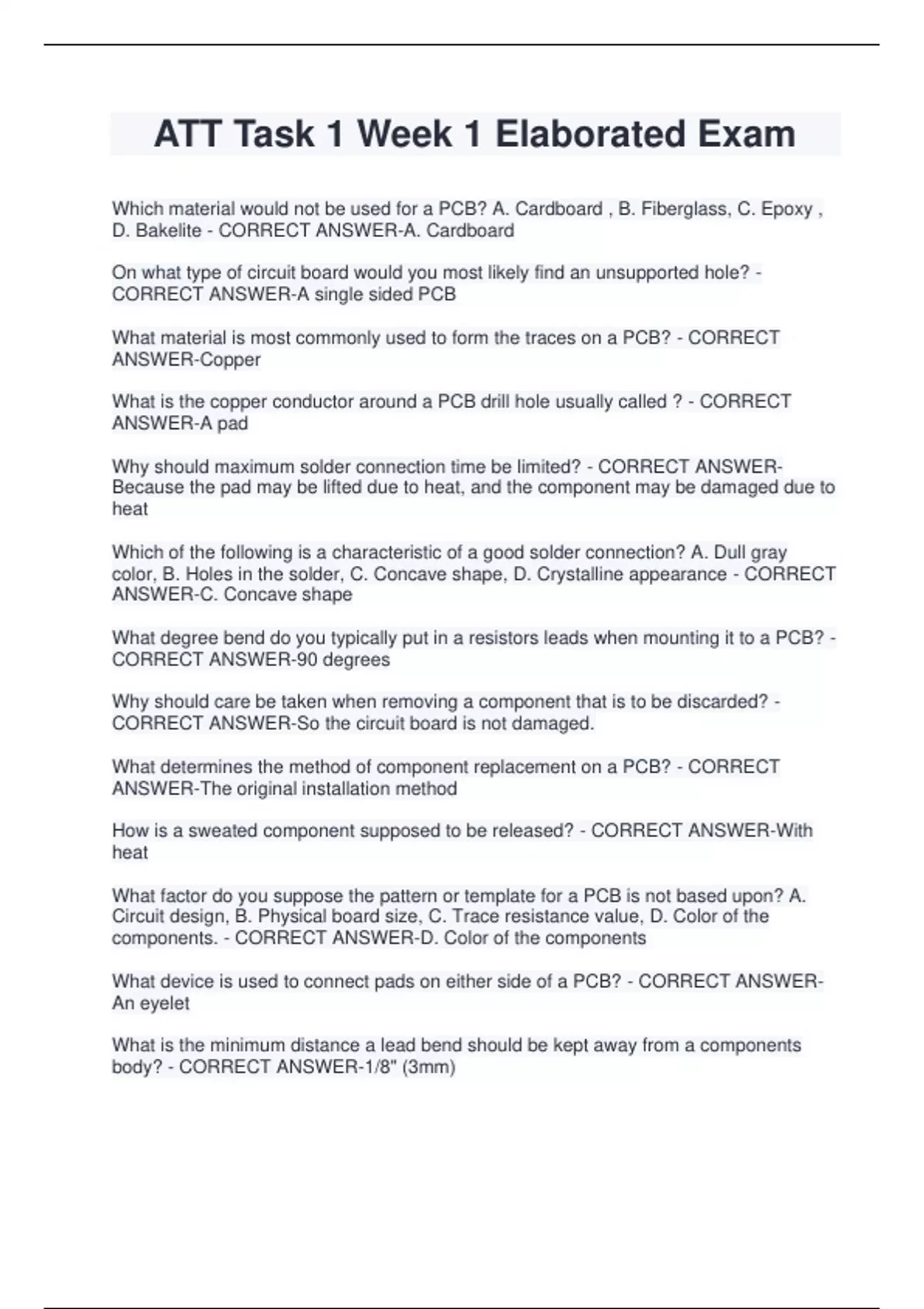 ATT Task 1 Week 1 Elaborated Exam Which material would not be used for a PCB? A. Cardboard , B. Fiberglass, C. Epoxy , D. Bakelite - CORRECT ANSWER-A. Cardboard On what type of circuit board would you most likely find an unsupported hole? - CORRECT ANSWER-A single sided PCB What material is most commonly used to form the traces on a PCB? - CORRECT ANSWER-Copper What is the copper conductor around a PCB drill hole usually called ? - CORRECT ANSWER-A pad Why should maximum solder connection time be limited? - CORRECT ANSWERBecause the pad may be lifted due to heat, and the component may be damaged due to heat Which of the following is a characteristic of a good solder connection? A. Dull gray color, B. Holes in the solder, C. Concave shape, D. Crystalline appearance - CORRECT ANSWER-C. Concave shape What degree bend do you typically put in a resistors leads when mounting it to a PCB? - CORRECT ANSWER-90 degrees Why should care be taken when removing a component that is to be discarded? - CORRECT ANSWER-So the circuit board is not damaged. What determines the method of component replacement on a PCB? - CORRECT ANSWER-The original installation method How is a sweated component supposed to be released? - CORRECT ANSWER-With heat What factor do you suppose the pattern or template for a PCB is not based upon? A. Circuit design, B. Physical board size, C. Trace resistance value, D. Color of the components. - CORRECT ANSWER-D. Color of the components What device is used to connect pads on either side of a PCB? - CORRECT ANSWERAn eyelet What is the minimum distance a lead bend should be kept away from a components body? - CORRECT ANSWER-1/8" (3mm) Why should a component lead not be bent right at the lead/body junction? - CORRECT ANSWER-This bend mechanically stresses the component What is the simplest method of open trace repair? - CORRECT ANSWER-Surface wire jumper What is the preferred method of repairing a lifted trace? - CORRECT ANSWER-Over bonding What is the process of removing copper from a blank PCB called? - CORRECT ANSWER-Etching One advantage of tinning a soldering iron t