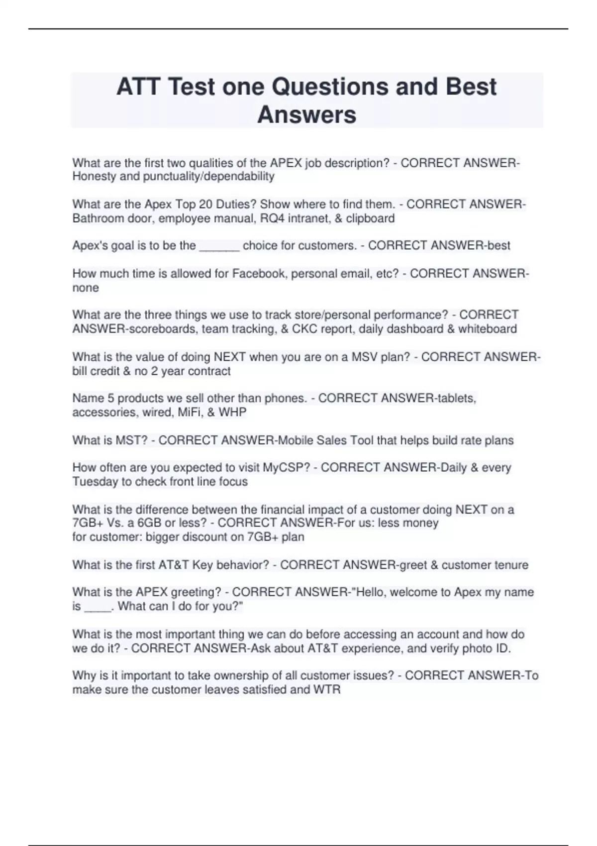 ATT Test one Questions and Best Answers What are the first two qualities of the APEX job description? - CORRECT ANSWERHonesty and punctuality/dependability What are the Apex Top 20 Duties? Show where to find them. - CORRECT ANSWERBathroom door, employee manual, RQ4 intranet, & clipboard Apex's goal is to be the ______ choice for customers. - CORRECT ANSWER-best How much time is allowed for Facebook, personal email, etc? - CORRECT ANSWERnone What are the three things we use to track store/personal performance? - CORRECT ANSWER-scoreboards, team tracking, & CKC report, daily dashboard & whiteboard What is the value of doing NEXT when you are on a MSV plan? - CORRECT ANSWERbill credit & no 2 year contract Name 5 products we sell other than phones. - CORRECT ANSWER-tablets, accessories, wired, MiFi, & WHP What is MST? - CORRECT ANSWER-Mobile Sales Tool that helps build rate plans How often are you expected to visit MyCSP? - CORRECT ANSWER-Daily & every Tuesday to check front line focus What is the difference between the financial impact of a customer doing NEXT on a 7GB+ Vs. a 6GB or less? - CORRECT ANSWER-For us: less money for customer: bigger discount on 7GB+ plan What is the first AT&T Key behavior? - CORRECT ANSWER-greet & customer tenure What is the APEX greeting? - CORRECT ANSWER-"Hello, welcome to Apex my name is ____. What can I do for you?" What is the most important thing we can do before accessing an account and how do we do it? - CORRECT ANSWER-Ask about AT&T experience, and verify photo ID. Why is it important to take ownership of all customer issues? - CORRECT ANSWER-To make sure the customer leaves satisfied and WTR What is the goal of every transaction? - CORRECT ANSWER-To use 5 FORE=1 & customer willing to recommen