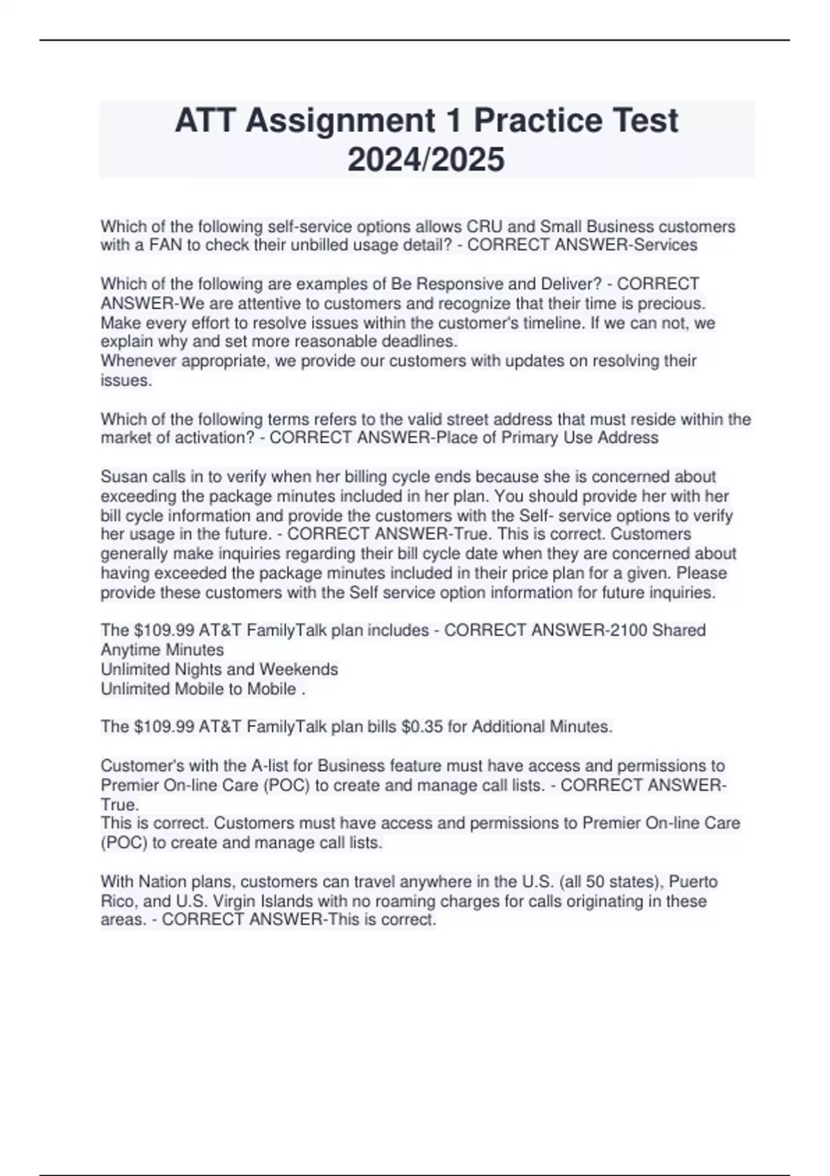 ATT Assignment 1 Practice Test 2024/2025 Which of the following self-service options allows CRU and Small Business customers with a FAN to check their unbilled usage detail? - CORRECT ANSWER-Services Which of the following are examples of Be Responsive and Deliver? - CORRECT ANSWER-We are attentive to customers and recognize that their time is precious. Make every effort to resolve issues within the customer's timeline. If we can not, we explain why and set more reasonable deadlines. Whenever appropriate, we provide our customers with updates on resolving their issues. Which of the following terms refers to the valid street address that must reside within the market of activation? - CORRECT ANSWER-Place of Primary Use Address Susan calls in to verify when her billing cycle ends because she is concerned about exceeding the package minutes included in her plan. You should provide her with her bill cycle information and provide the customers with the Self- service options to verify her usage in the future. - CORRECT ANSWER-True. This is correct. Customers generally make inquiries regarding their bill cycle date when they are concerned about having exceeded the package minutes included in their price plan for a given. Please provide these customers with the Self service option information for future inquiries. The $109.99 AT&T FamilyTalk plan includes - CORRECT ANSWER-2100 Shared Anytime Minutes Unlimited Nights and Weekends Unlimited Mobile to Mobile . The $109.99 AT&T FamilyTalk plan bills $0.35 for Additional Minutes. Customer's with the A-list for Business feature must have access and permissions to Premier On-line Care (POC) to create and manage call lists. - CORRECT ANSWERTrue. This is correct. Customers must have access and permissions to Premier On-line Care (POC) to create and manage call lists. With Nation plans, customers can travel anywhere in the U.S. (all 50 states), Puerto Rico, and U.S. Virgin Islands with no roaming charges for calls originating in these areas. - CORRECT ANSWER-This is correct