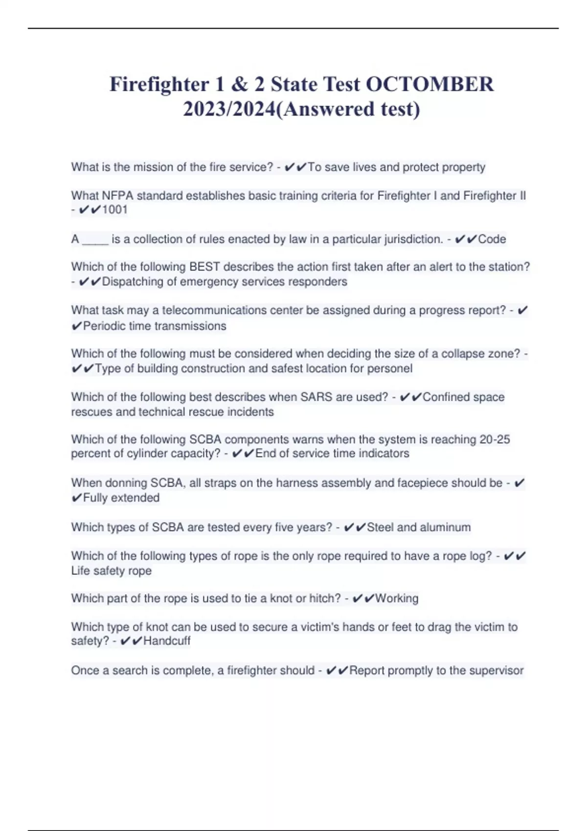 Firefighter 1 & 2 State Test OCTOMBER 2023/2024(Answered test)