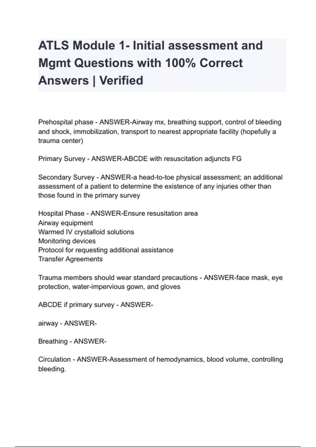 ATLS Module 1- Initial assessment and Mgmt Questions with 100% Correct