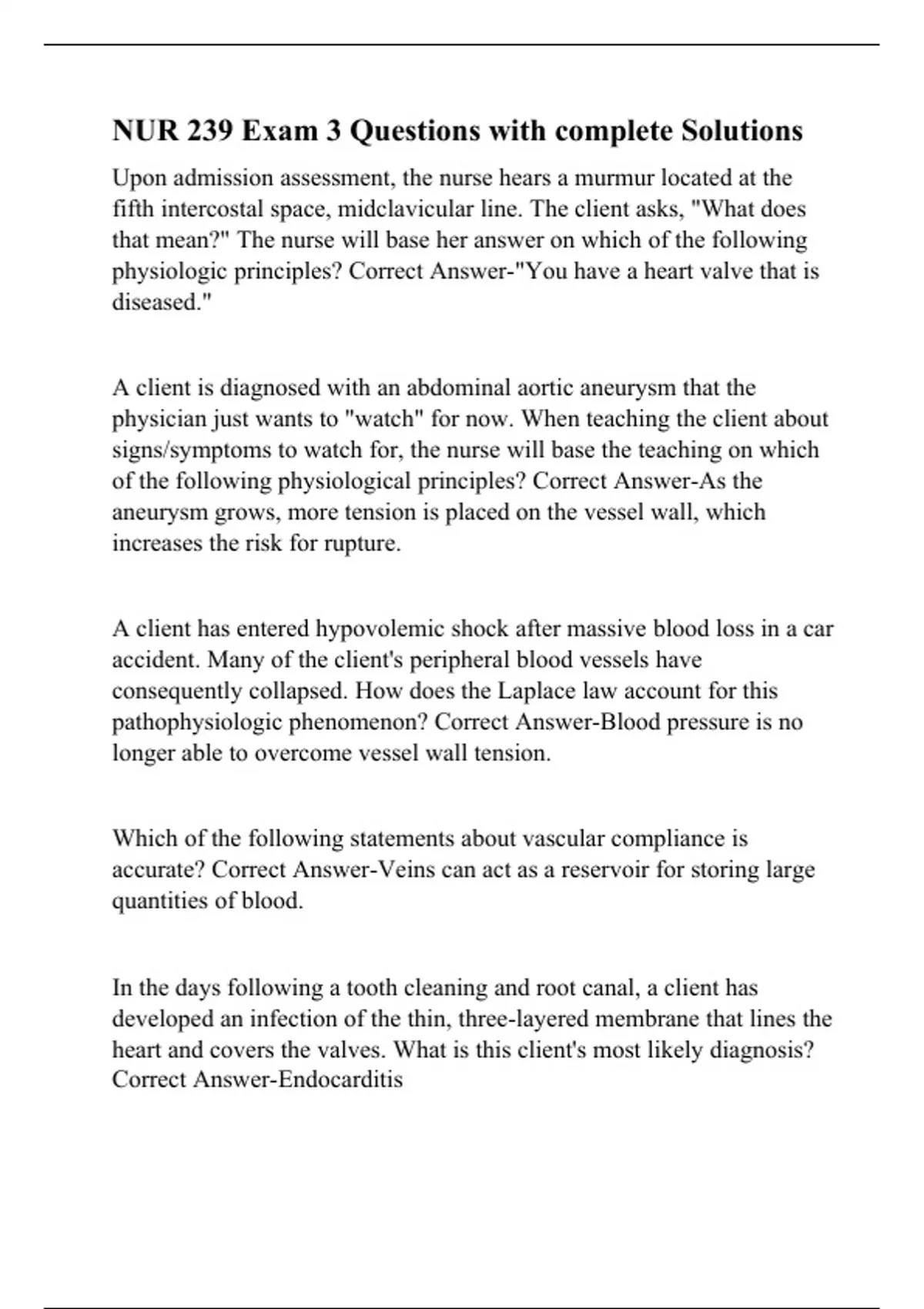 Upon admission assessment, the nurse hears a murmur located at the fifth intercostal space, midclavicular line. The client asks, "What does that mean?" The nurse will base her answer on which of the following physiologic principles? Correct Answer-"You have a heart valve that is diseased." A client is diagnosed with an abdominal aortic aneurysm that the physician just wants to "watch" for now. When teaching the client about signs/symptoms to watch for, the nurse will base the teaching on which of the following physiological principles? Correct Answer-As the aneurysm grows, more tension is placed on the vessel wall, which increases the risk for rupture. A client has entered hypovolemic shock after massive blood loss in a car accident. Many of the client's peripheral blood vessels have consequently collapsed. How does the Laplace law account for this pathophysiologic phenomenon? Correct Answer-Blood pressure is no longer able to overcome vessel wall tension. Which of the following statements about vascular compliance is accurate? Correct Answer-Veins can act as a reservoir for storing large quantities of blood.