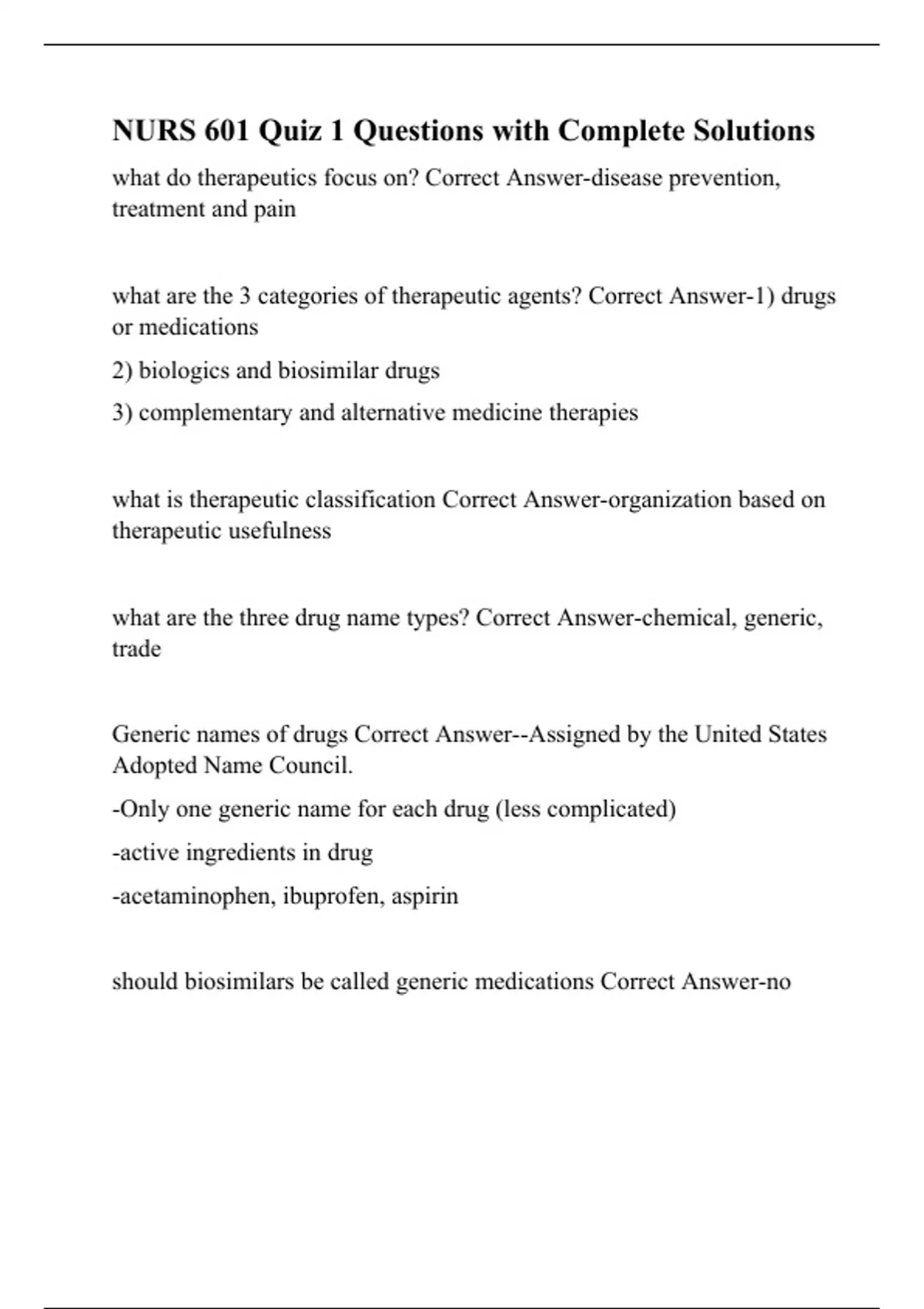 what do therapeutics focus on? Correct Answer-disease prevention, treatment and pain what are the 3 categories of therapeutic agents? Correct Answer-1) drugs or medications 2) biologics and biosimilar drugs 3) complementary and alternative medicine therapies what is therapeutic classification Correct Answer-organization based on therapeutic usefulness what are the three drug name types? Correct Answer-chemical, generic, trade Generic names of drugs Correct Answer--Assigned by the United States Adopted Name Council. -Only one generic name for each drug (less complicated) -active ingredients in drug -acetaminophen, ibuprofen, aspirin should biosimilars be called generic medications Correct Answer-no