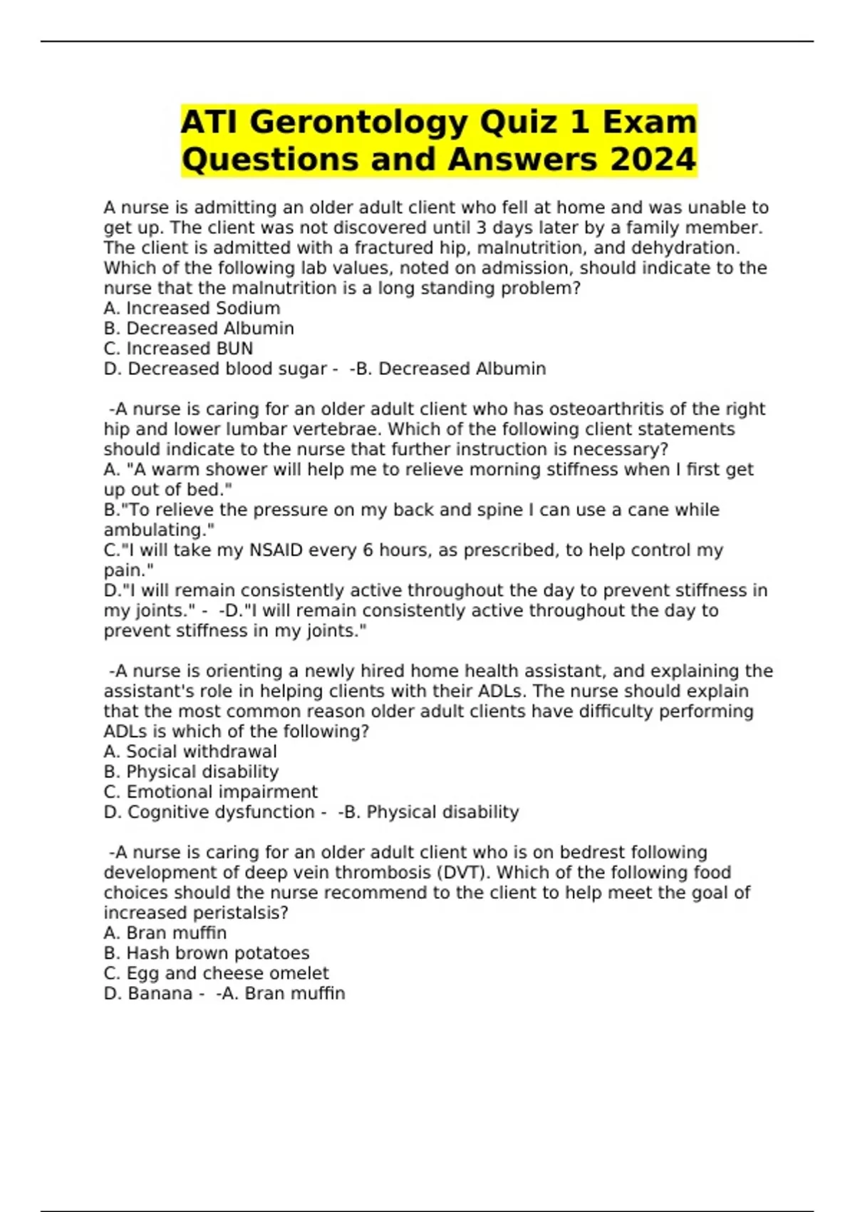 ATI Gerontology Quiz 1 Exam Questions and Answers 2024