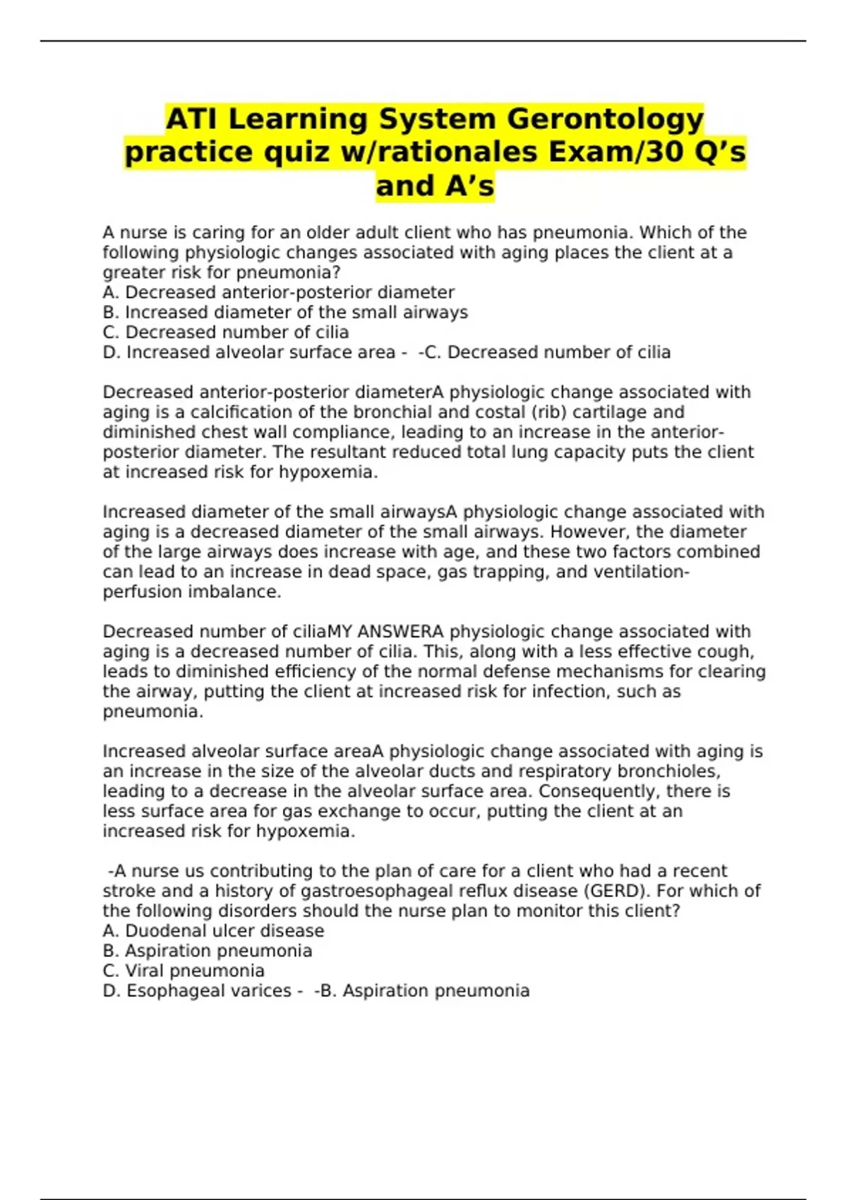 ATI Learning System Gerontology practice quiz w/rationales Exam/30 Q’s and A’s