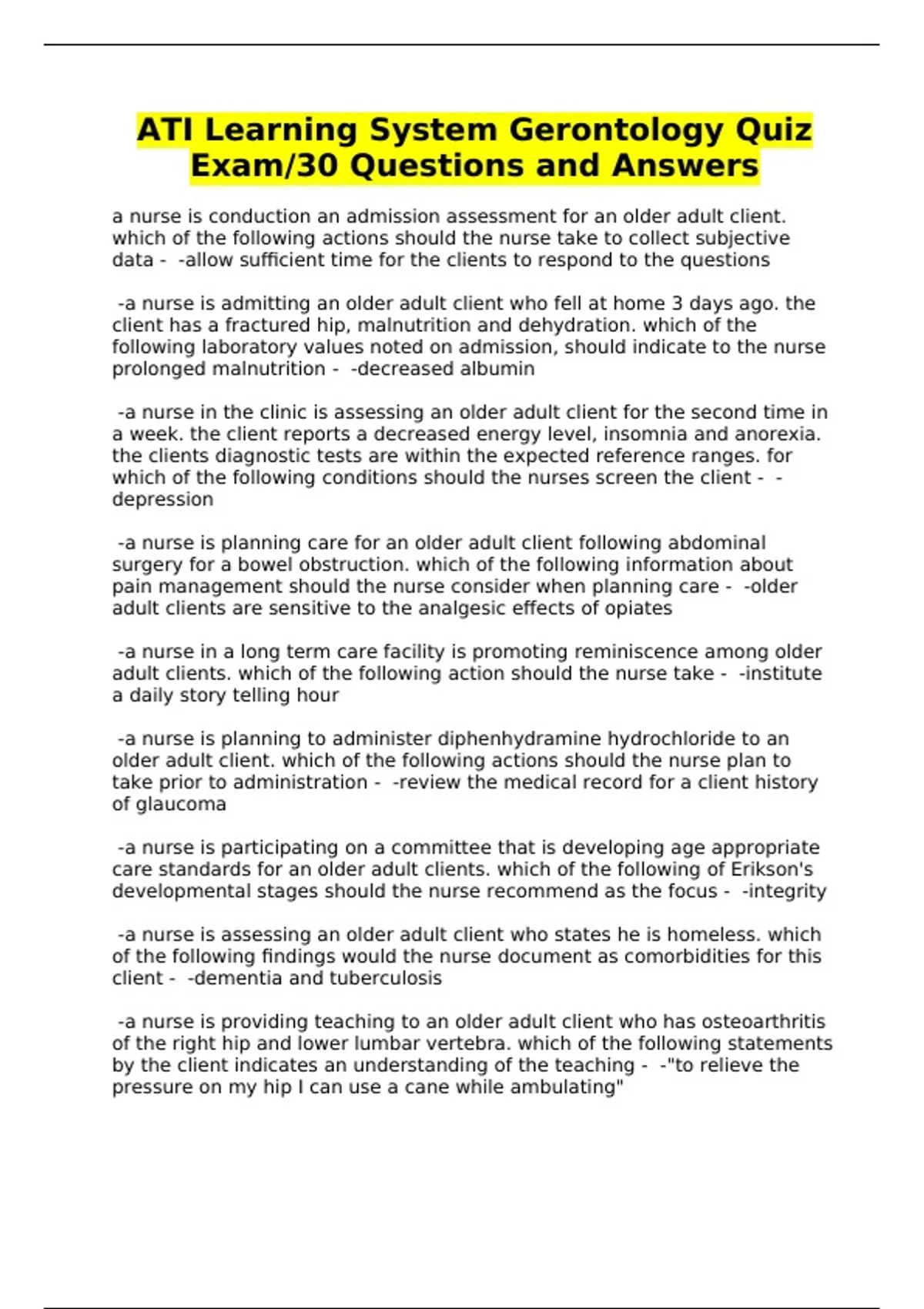 ATI Learning System Gerontology Quiz Exam/30 Questions and Answers