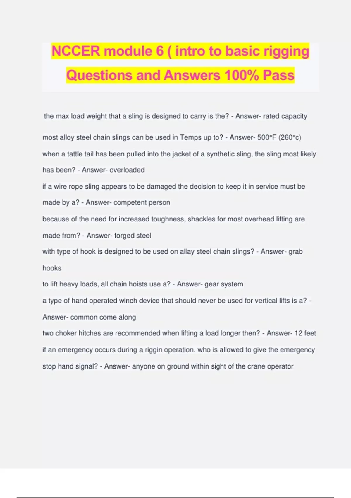NCCER module 6 ( intro to basic rigging Questions and Answers 100% Pass the max load weight that a sling is designed to carry is the? - Answer- rated capacity most alloy steel chain slings can be used in Temps up to? - Answer- 500°F (260°c) when a tattle tail has been pulled into the jacket of a synthetic sling, the sling most likely has been? - Answer- overloaded if a wire rope sling appears to be damaged the decision to keep it in service must be made by a? - Answer- competent person