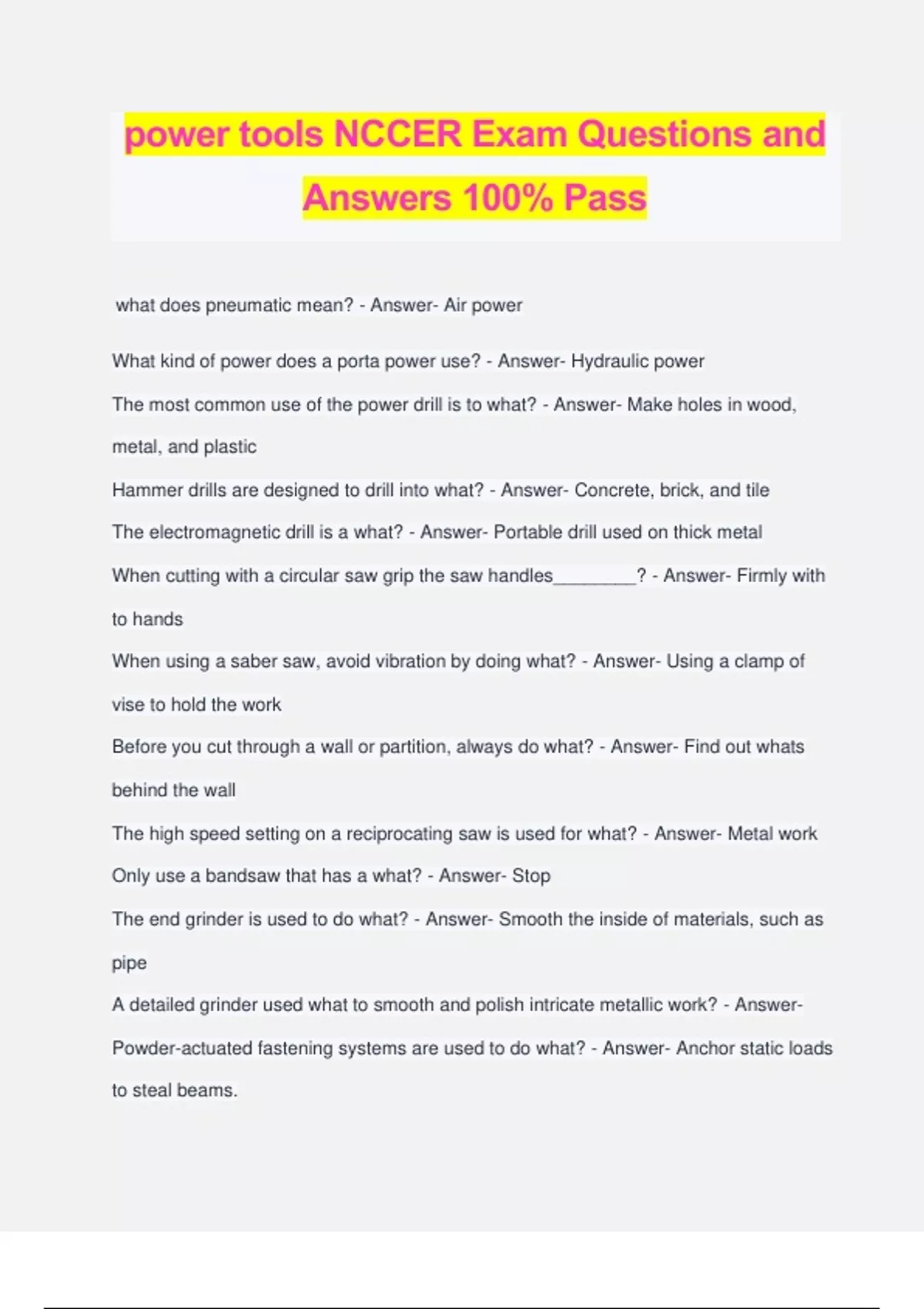 power tools NCCER Exam Questions and Answers 100% Pass what does pneumatic mean? - Answer- Air power What kind of power does a porta power use? - Answer- Hydraulic power The most common use of the power drill is to what? - Answer- Make holes in wood, metal, and plastic Hammer drills are designed to drill into what? - Answer- Concrete, brick, and tile The electromagnetic drill is a what? - Answer- Portable drill used on thick metal When cutting with a circular saw grip the saw handles________? - Answer- Firmly with to hands When using a saber saw, avoid vibration by doing what? - Answer- Using a clamp of vise to hold the work Before you cut through a wall or partition, always do what? - Answer- Find out whats behind the wall The high speed setting on a reciprocating saw is used for what? - Answer- Metal work Only use a bandsaw that has a what? - Answer- Stop The end grinder is used to do what? - Answer- Smooth the inside of materials, such as pipe A detailed grinder used what to smooth and polish intricate metallic work? - Answer- Powder-actuated fastening systems are used to do what? - Answer- Anchor static loads to steal beams