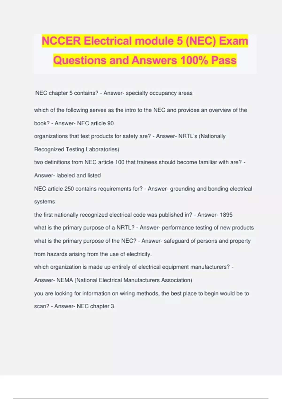 NCCER Electrical module 5 (NEC) Exam Questions and Answers 100% Pass NEC chapter 5 contains? - Answer- specialty occupancy areas which of the following serves as the intro to the NEC and provides an overview of the book? - Answer- NEC article 90 organizations that test products for safety are? - Answer- NRTL's (Nationally Recognized Testing Laboratories) two definitions from NEC article 100 that trainees should become familiar with are? - Answer- labeled and listed NEC article 250 contains requirements for? - Answer- grounding and bonding electrical systems