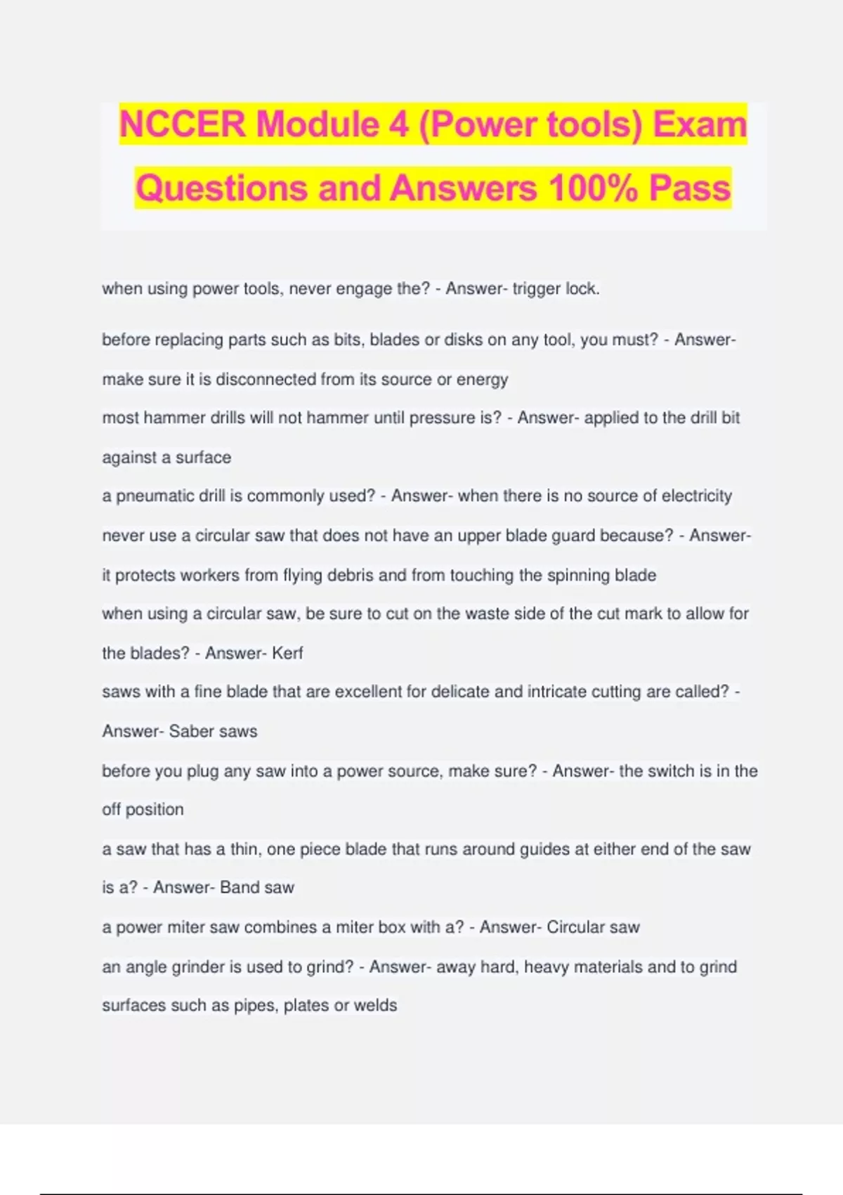 NCCER Module 4 (Power tools) Exam Questions and Answers 100% Pass when using power tools, never engage the? - Answer- trigger lock. before replacing parts such as bits, blades or disks on any tool, you must? - Answer- make sure it is disconnected from its source or energy most hammer drills will not hammer until pressure is? - Answer- applied to the drill bit against a surface a pneumatic drill is commonly used? - Answer- when there is no source of electricity never use a circular saw that does not have an upper blade guard because? - Answer- it protects workers from flying debris and from touching the spinning blade when using a circular saw, be sure to cut on the waste side of the cut mark to allow for the blades? - Answer- Kerf saws with a fine blade that are excellent for delicate and intricate cutting are called? - Answer- Saber saws before you plug any saw into a power source, make sure? - Answer- the switch is in the off position