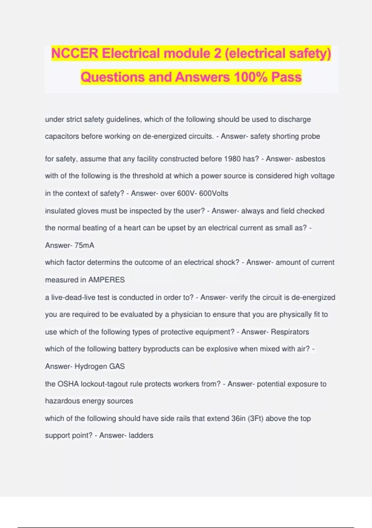 NCCER Electrical module 2 (electrical safety) Questions and Answers 100% Pass under strict safety guidelines, which of the following should be used to discharge capacitors before working on de-energized circuits. - Answer- safety shorting probe for safety, assume that any facility constructed before 1980 has? - Answer- asbestos with of the following is the threshold at which a power source is considered high voltage in the context of safety? - Answer- over 600V- 600Volts insulated gloves must be inspected by the user? - Answer- always and field checked the normal beating of a heart can be upset by an electrical current as small as? - Answer- 75mA which factor determins the outcome of an electrical shock? - Answer- amount of current measured in AMPERES a live-dead-live test is conducted in order to? - Answer- verify the circuit is de-energized you are required to be evaluated by a physician to ensure that you are physically fit to use which of the following types of protective equipment? - Answer- Respirators which of the following battery byproducts can be explosive when mixed with air? - Answer- Hydrogen GAS the OSHA lockout-tagout rule protects workers from? - Answer- potential exposure to hazardous energy sources which of the following should have side rails that extend 36in (3Ft) above the top support point? - Answer- ladders