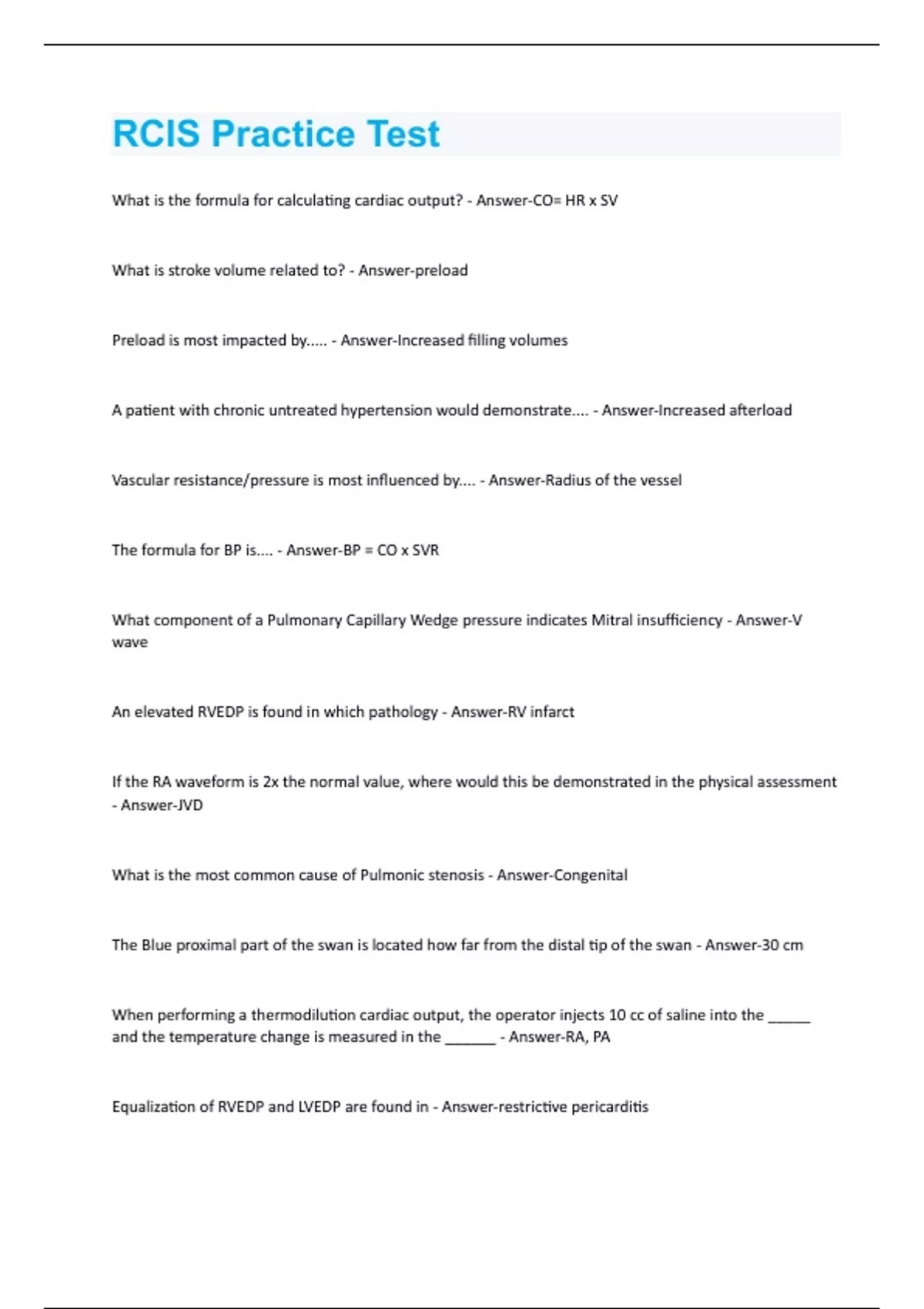 What is the formula for calculating cardiac output? - Answer-CO= HR x SV What is stroke volume related to? - Answer-preload Preload is most impacted by..... - Answer-Increased filling volumes A patient with chronic untreated hypertension would demonstrate.... - Answer-Increased afterload Vascular resistance/pressure is most influenced by.... - Answer-Radius of the vessel The formula for BP is.... - Answer-BP = CO x SVR What component of a Pulmonary Capillary Wedge pressure indicates Mitral insufficiency - Answer-V wave An elevated RVEDP is found in which pathology - Answer-RV infarct If the RA waveform is 2x the normal value, where would this be demonstrated in the physical assessment - Answer-JVD What is the most common cause of Pulmonic stenosis - Answer-Congenital The Blue proximal part of the swan is located how far from the distal tip of the swan - Answer-30 cm When performing a thermodilution cardiac output, the operator injects 10 cc of saline into the _____ and the temperature change is measured in the ______ - Answer-RA, PA Equalization of RVEDP and LVEDP are found in - Answer-restrictive pericarditisSigns of Right sided heart failure include - Answer-JVD Based on these oxygen saturations, what type of shunt is present? SVC sat= 67% IVC sat= 71% RA sat= 85% RV sat= 85% PA sat= 85% LA sat= 98% LV sat= 98% AO sat= 98% - Answer-L to R ASD What type of ASD, located in the middle 1/3 of the atrial septum (the former site of the fossa ovalis) is called - Answer-Ostium Secundum What is the Flamm's equation - Answer-3(SVC) + 1(IVC)/4 The formula used to calculate MAP is - Answer-1 (systolic) + 2 (diastolic)/3 What are the four anomalies associated with Tetralogy of Fallot - Answer-Pulmonic stenosis, over riding aorta, RVH, VSD Which fetal anomaly is characterized by a large VSD over which a large single great vessel arises - Answer-Truncas Arteriosus Pulsus Paradoxus is a sign of - Answer-Cardiac Tamponade What does RAD stand for - Answer-Radiation absorbed dose What component of the X-ray system converts light rays into images - Answer-Image intensifier What is the maximum annual dose of radiation one can receive annually - Answer-5 REM Lead protection should be at least how many millimeters of lead - Answer-.5 What is the minimum safe distance to position oneself from the X-ray source - Answer-6 feetIn an X-ray tube what is the charge on the cathode and the anode - Answer-Cathode: positive Anode: negative Which view exposes the operator to the greatest amount of radiation - Answer-Lateral What converts x-rays into an image - Answer-Image Intensifier The contrast that is best for a patient is - Answer-low osmolality Radiolucent means - Answer-X-rays are permitted to pass through Radiopaque means - Answer-X-rays are not permitted to pass through ReoPro works on - Answer-IIb/IIIa receptors Heparin potentiates the action of - Answer-Antithrombin Fibrinogen is converted to Fibrin by the action of - Answer-Thrombin There are _________ known pathways to imitate the clotting cascade - Answer-2 Aspirin inhibits the action of - Answer-Arachidonic Acid Which agent is not an antiplatelet - Answer-Heparin If a patient has diabetes and renal failure with a creatinine of 2.0 what would you give - Answer-fluids to hydrateIf a patient is taking NPH insulin, which medication should not be given - Answer-Protamine Which medication is most commonly given to a patient with SVT - Answer-Adenosine True/False If a patient has a creatinine greater than 1.4 contrast volume should be minimized - Answer-True Lidocaine converts from 2GM in 500cc to - Answer-4 mg in 1 cc Dopamine concentration 1600 mcg/ml in 250cc yields a concetration of - Answer-400 mg in 250cc