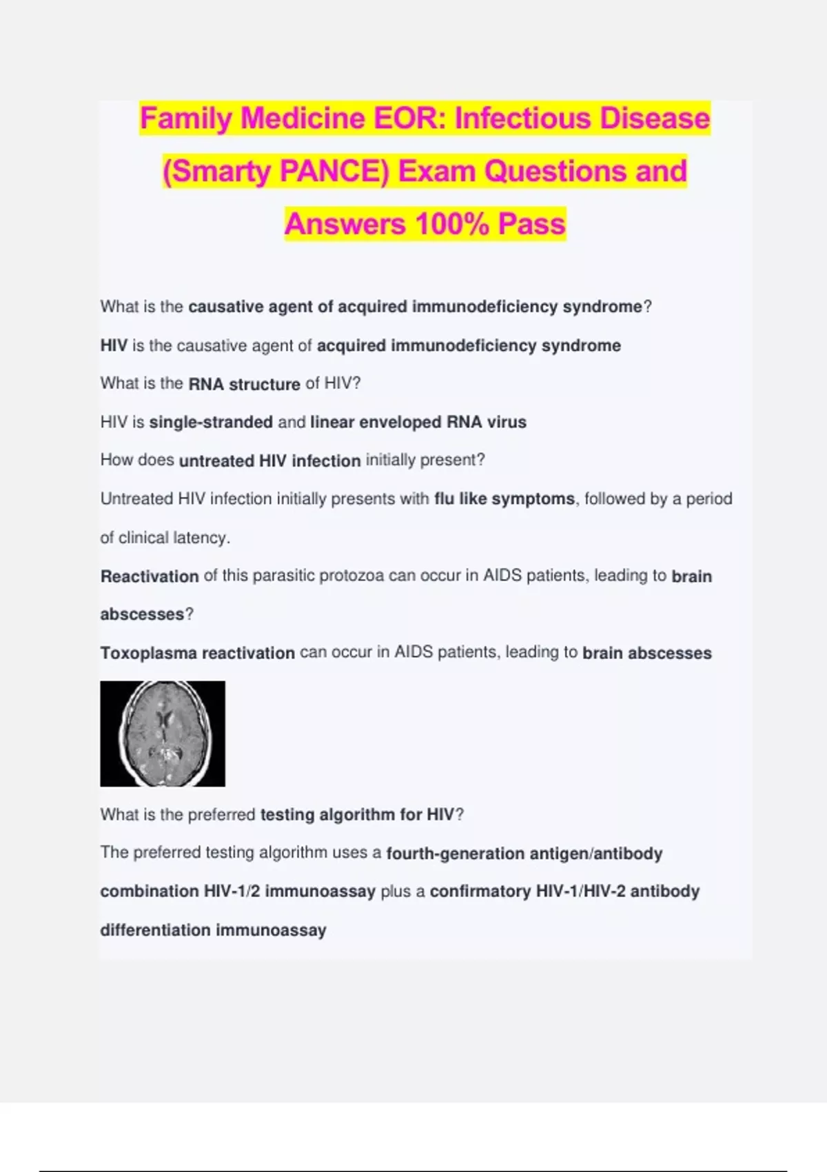 Family Medicine EOR: Infectious Disease (Smarty PANCE) Exam Questions and Answers 100% Pass What is the causative agent of acquired immunodeficiency syndrome? HIV is the causative agent of acquired immunodeficiency syndrome What is the RNA structure of HIV? HIV is single-stranded and linear enveloped RNA virus How does untreated HIV infection initially present? Untreated HIV infection initially presents with flu like symptoms, followed by a period of clinical latency. Reactivation of this parasitic protozoa can occur in AIDS patients, leading to brain abscesses? Toxoplasma reactivation can occur in AIDS patients, leading to brain abscesses What is the preferred testing algorithm for HIV? The preferred testing algorithm uses a fourth-generation antigen/antibody combination HIV-1/2 immunoassay plus a confirmatory HIV-1/HIV-2 antibody differentiation immunoassay An alternative approach involves ELISA (screening test) which if positive is confirmed by Western Blot. Rapid testing is done by blood or saliva test with confirmatory testing if positive Progressive multifocal leukoencephalopathy typically occurs in AIDS patients with a CD4+ cell count less what? Progressive multifocal leukoencephalopathy typically occurs in AIDS patients with a CD4+ cell count of less than 200/mm3. What are the chances of contracting HIV from a needlestick injury involving a patient with known HIV? The chances of contracting HIV from a needlestick injury involving a patient with known HIV is < 0.3% Pneumocystis jiroveci pneumonia typically occurs in AIDS patients with a CD4+ cell count less than what? Pneumocystis jirovecii pneumonia typically occurs in AIDS patients with a CD4+ cell count of less than 200/mm3 When should PEP be started after exposure?