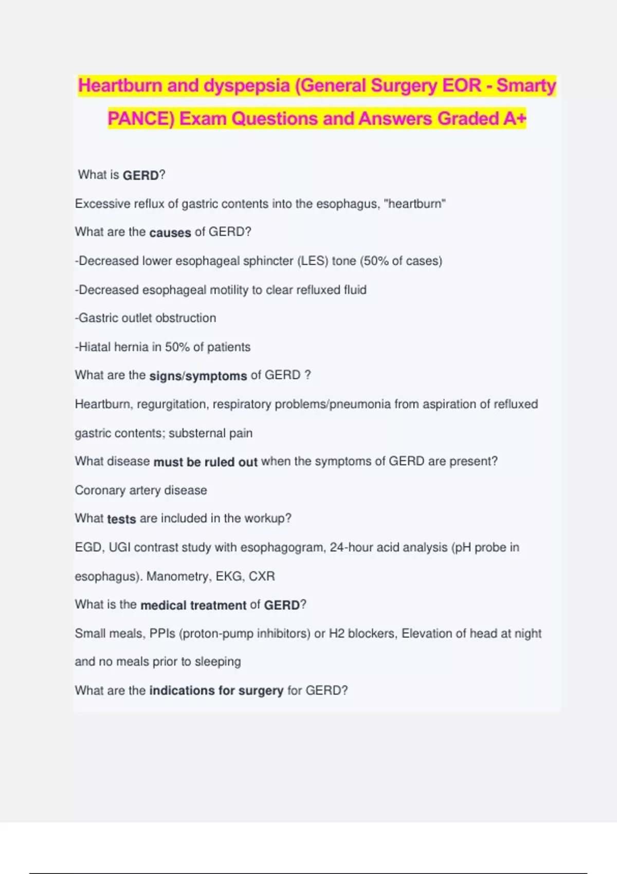 Heartburn and dyspepsia (General Surgery EOR - Smarty PANCE) Exam Questions and Answers Graded A+ What is GERD? Excessive reflux of gastric contents into the esophagus, "heartburn" What are the causes of GERD? -Decreased lower esophageal sphincter (LES) tone (50% of cases) -Decreased esophageal motility to clear refluxed fluid -Gastric outlet obstruction -Hiatal hernia in 50% of patients What are the signs/symptoms of GERD ? Heartburn, regurgitation, respiratory problems/pneumonia from aspiration of refluxed gastric contents; substernal pain What disease must be ruled out when the symptoms of GERD are present? Coronary artery disease What tests are included in the workup? EGD, UGI contrast study with esophagogram, 24-hour acid analysis (pH probe in esophagus). Manometry, EKG, CXR What is the medical treatment of GERD? Small meals, PPIs (proton-pump inhibitors) or H2 blockers, Elevation of head at night and no meals prior to sleeping What are the indications for surgery for GERD?