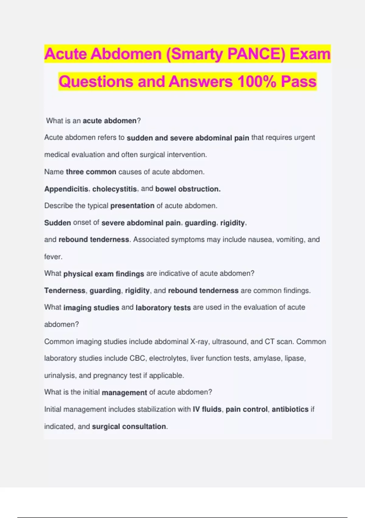 Acute Abdomen (Smarty PANCE) Exam Questions and Answers 100% Pass What is an acute abdomen? Acute abdomen refers to sudden and severe abdominal pain that requires urgent medical evaluation and often surgical intervention. Name three common causes of acute abdomen. Appendicitis, cholecystitis, and bowel obstruction. Describe the typical presentation of acute abdomen. Sudden onset of severe abdominal pain, guarding, rigidity, and rebound tenderness. Associated symptoms may include nausea, vomiting, and fever. What physical exam findings are indicative of acute abdomen? Tenderness, guarding, rigidity, and rebound tenderness are common findings. What imaging studies and laboratory tests are used in the evaluation of acute abdomen? Common imaging studies include abdominal X-ray, ultrasound, and CT scan. Common laboratory studies include CBC, electrolytes, liver function tests, amylase, lipase, urinalysis, and pregnancy test if applicable. What is the initial management of acute abdomen? Initial management includes stabilization with IV fluids, pain control, antibiotics if indicated, and surgical consultation.