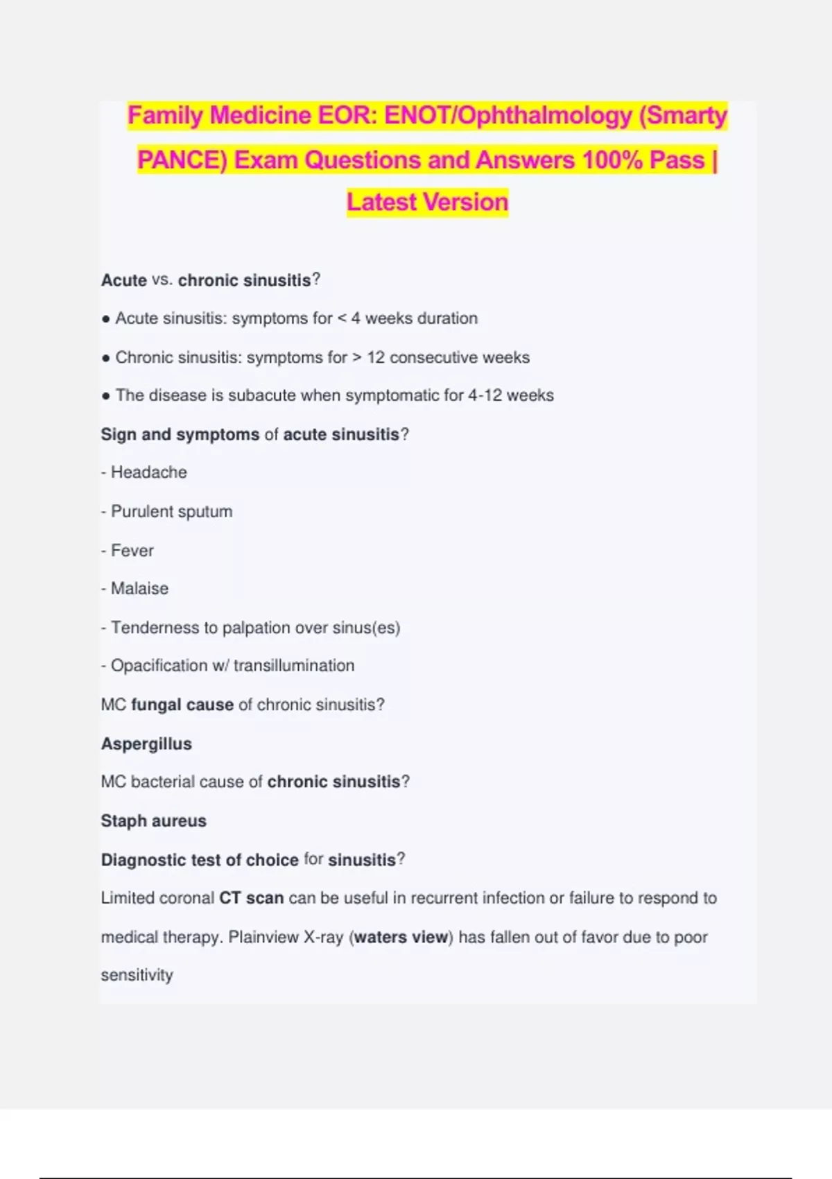 Family Medicine EOR: ENOT/Ophthalmology (Smarty PANCE) Exam Questions and Answers 100% Pass | Latest Version Acute vs. chronic sinusitis? ● Acute sinusitis: symptoms for < 4 weeks duration ● Chronic sinusitis: symptoms for > 12 consecutive weeks ● The disease is subacute when symptomatic for 4-12 weeks Sign and symptoms of acute sinusitis? - Headache - Purulent sputum - Fever - Malaise - Tenderness to palpation over sinus(es) - Opacification w/ transillumination MC fungal cause of chronic sinusitis? Aspergillus MC bacterial cause of chronic sinusitis? Staph aureus Diagnostic test of choice for sinusitis? Limited coronal CT scan can be useful in recurrent infection or failure to respond to medical therapy. Plainview X-ray (waters view) has fallen out of favor due to poor sensitivity When to give antibiotics for acute sinusitis? > 10 -14 days or severely ill. Antibiotics can shorten time to cure but only in 5 to 11 people per 100 and most improve without antimicrobial therapy. First line antibiotics for acute sinusitis? The first-line antibiotic is amoxicillin/clavulanate, with doxycycline or respiratory fluoroquinolones as alternatives. Treat for 5 to 7 days in adults if uncomplicated bacterial rhinosinusitis (IDSA low-moderate-quality evidence). Treat for 10 to 14 days in children if uncomplicated bacterial rhinosinusitis (IDSA low-moderate- quality evidence). Second-line therapy for acute sinusitis (for those who fail to improve within 7 days)? Second-line therapy (for those who fail to improve within 7 days) includes high-dose Augmentin (2 g BID x 7 days), Moxifloxacin, Levofloxacin, or a third-generation cephalosporin plus clindamycin. Treatment of chronic rhinosinusitis (CRS)? Chronic rhinosinusitis (CRS) lasts 12 weeks or longer, despite attempts at medical management. Therapy is typically given for at least three weeks and may be extended for up to ten weeks in refractory cases. Augmentin or clindamycin are reasonable treatment options Viral rhinitis PE signs? Erythematous turbinate's Allergic rhinitis PE signs? Patients with allergic rhinitis will present with boggy turbinates, allergic shiners (edematous, dark circles under eyes), and allergic salute What is an allergic salute? The transverse line on the nose which is a feature of chronic allergies - formed when a child chronically pushes the nose up and back to relieve itching and free swollen turbinates Diagnosis of allergic rhinitis? Allergic rhinitis can almost always be diagnosed based on history alone. Diagnostic testing is not routinely needed unless patients do not improve when treated empirically; for such patients, skin tests or an allergen-specific serum IgE test is done. Diagnosis of nonallergic rhinitis? Nonallergic perennial rhinitis is usually also diagnosed based on history. Lack of clinical response to treatment for assumed allergic rhinitis and negative results on skin tests and/or an allergen-specific serum IgE test also suggests a nonallergic cause Treatments for allergic rhinitis? Treatment for allergic rhinitis includes the avoidance of any known allergens and use of antihistamines, cromolyn sodium, nasal or systemic corticosteroids, nasal saline drops or washes, and immunotherapy Most effective therapy for allergic rhinitis? Intranasal corticosteroids Painful oral lesions that appear as localized, shallow, round to oval ulcers with a yellowish adherent central exudate Aphthous ulcerations Aphthous ulcers are associated with which virus? HHV6 Aphthous ulcers are most often triggered by what? Aphthous ulcers are most often triggered by trauma insid
