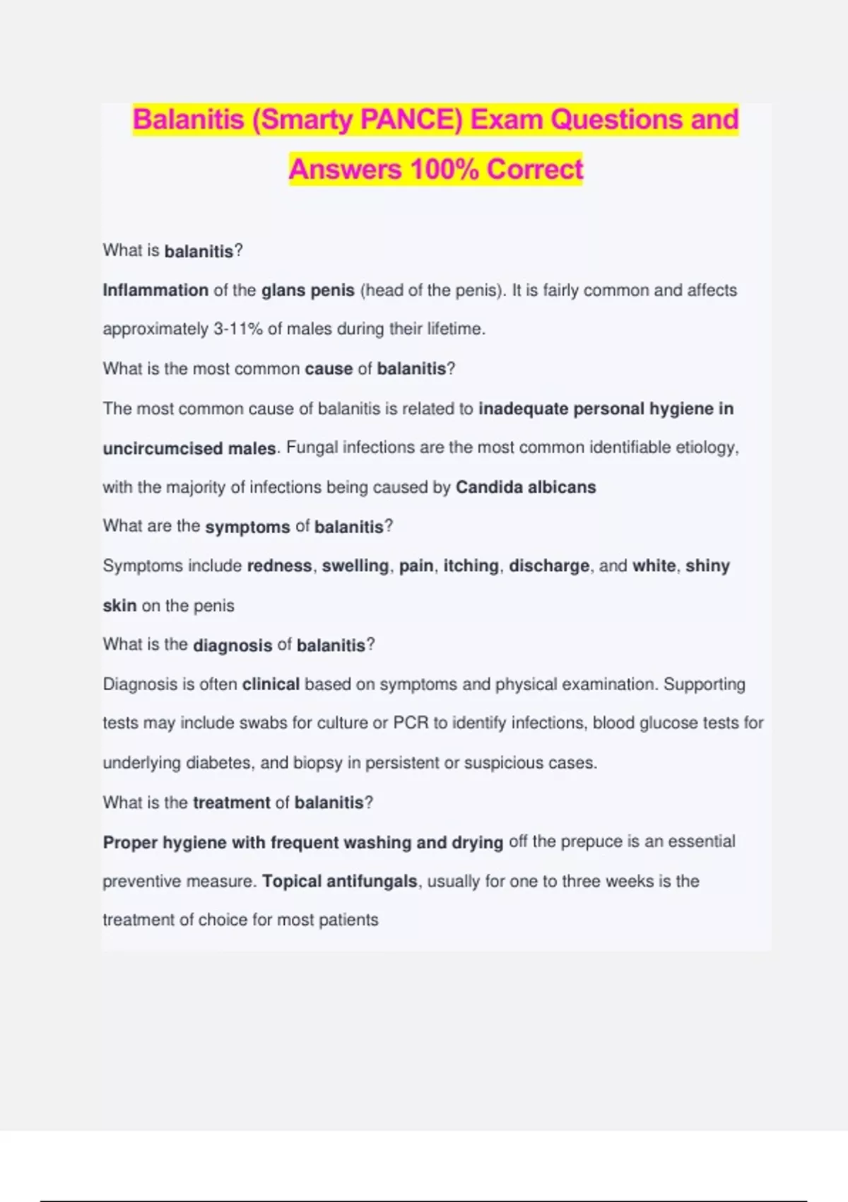 Balanitis (Smarty PANCE) Exam Questions and Answers 100% Correct What is balanitis? Inflammation of the glans penis (head of the penis). It is fairly common and affects approximately 3-11% of males during their lifetime. What is the most common cause of balanitis? The most common cause of balanitis is related to inadequate personal hygiene in uncircumcised males. Fungal infections are the most common identifiable etiology, with the majority of infections being caused by Candida albicans What are the symptoms of balanitis?