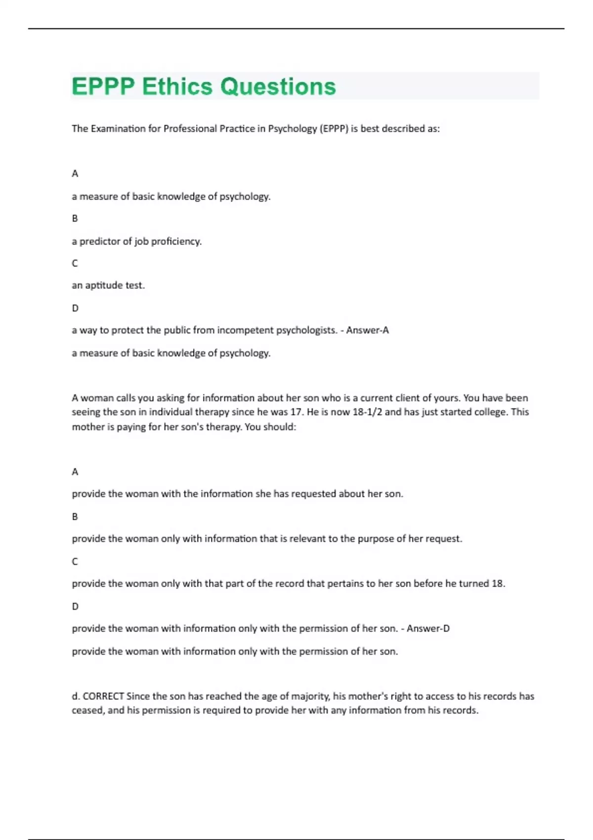 The Examination for Professional Practice in Psychology (EPPP) is best described as: A a measure of basic knowledge of psychology. B a predictor of job proficiency. C an aptitude test. D a way to protect the public from incompetent psychologists. - Answer-A a measure of basic knowledge of psychology. A woman calls you asking for information about her son who is a current client of yours. You have been seeing the son in individual therapy since he was 17. He is now 18-1/2 and has just started college. This mother is paying for her son's therapy. You should: A provide the woman with the information she has requested about her son. B provide the woman only with information that is relevant to the purpose of her request. C provide the woman only with that part of the record that pertains to her son before he turned 18. D provide the woman with information only with the permission of her son. - Answer-D provide the woman with information only with the permission of her son. d. CORRECT Since the son has reached the age of majority, his mother's right to access to his records has ceased, and his permission is required to provide her with any information from his records.Of the cases processed by the APA's Ethics Committee as the result of revocation of a psychologist's license by a state licensing board, the most common complaint processed by the committee is which of the following? A loss of licensure in another jurisdiction B sexual misconduct C breach of confidentiality D issues related to competence - Answer-A loss of licensure in another jurisdiction A review of the reports of the APA's Ethics Committee published in the American Psychologist from 2000 through 2008 reveals that loss of licensure is the most frequent reason for the complaints processed by the Ethics Committee; followed by, in order, sexual misconduct with an adult, inappropriate practice involving child custody, nonsexual dual relationship, and inappropriate practice involving insurance or fees. The court offers a defendant the choice of jail or an in-patient alcohol treatment program after he is found guilty of driving while intoxicated. As the clinician who will be working with the man at the treatment center, you should keep in mind that: A a waiver of confidentiality is not required because treatment has been court-ordered. B a waiver of confidentiality is not required because the man gave up his right to confidentiality by committing the crime. Ca waiver of confidentiality is not required because the man gave up his right to confidentiality by choosing the treatment program instead of jail. D a waiver of confidentiality is required and should be obtained before you release any information about the man's treatment to the court. - Answer-d. CORRECT The usual procedure is for the individual to sign a waiver of confidentiality when he/she chooses the treatment option. However, you would want to check to make sure this has occurred and, if not, you would want to obtain a signed waiver. You suspect a colleague of violating ethical guidelines. To be consistent with the provisions of the Ethics Code, you should: A report the colleague to the local Ethics Committee immediately. B report the colleague to the local Ethics Committee only if the ethical violation is a serious one. C attempt to handle the situation informally by discussing the violation with the colleague and file a report only if he is uncooperative. D either handle the situation informally or file a report, depending on which course of action you believe is most appropriate. - Answer-d. CORRECT Psychologists can either attempt to resolve an ethical infraction informally or file a complaint with the Ethics Committee, depending on which course of action they deem most appropriate. (Of course, it is always necessary to consider client confidentiality first before taking any action, but none of the responses given address this issue.) The provisions of the Ethics Code allow psychologists to use their own discretion about the best course of action in cases where another psychologist is suspected of acting unethically. When a psychologist's work with clients will be supervised: A the client must be told about this arrangement. Bthe client must be told about this arrangement and be given the supervisor's name. C the client must be told about this arrangement only if his/her identity cannot be disguised in discussions with the supervisor. D the client must be told about this arrangement and, when the supervisor has legal responsibility for the case, must also be given the supervisor's name. - Answer-d. CORRECT The requirements for consultation and supervision are different and, even in a supervisory relationship, the information that must be given to the client varies, depending on the exact nature of the supervision. A client must always be told when a psychologist is being supervised but need be told the supervisor's name when the supervisor is legally responsible for the case. An ongoing debate in the literature centers on a therapist's responsibility when working with a client who is HIV-positive and is engaging in risky sexual behavior. A central issue in this debate is: A social responsibility. B client abandonment. C foreseeability of harm. D vicarious liability. - Answer-c. CORRECT In discussing this topic, S. Knapp and L. VandeCreek, for example, note that three issues are involved in the duty to protect: a fiduciary relationship, an identifiable victim, and the foreseeability of harm. They note that the "issue of foreseeability creates the greatest problems with the duty to protect with HIV-positive patients because the research has not identified all the risk factors involved in HIV transmission"