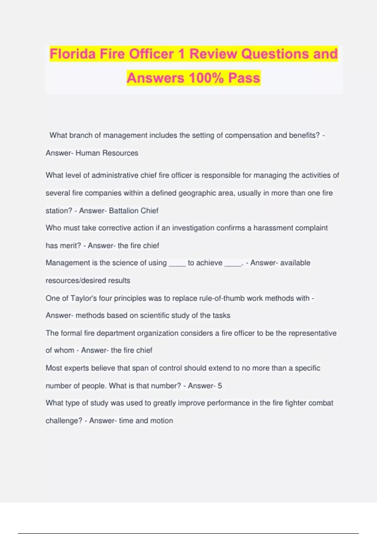 Florida Fire Officer 1 Review Questions and Answers 100% Pass What branch of management includes the setting of compensation and benefits? - Answer- Human Resources What level of administrative chief fire officer is responsible for managing the activities of several fire companies within a defined geographic area, usually in more than one fire station? - Answer- Battalion Chief Who must take corrective action if an investigation confirms a harassment complaint has merit? - Answer- the fire chief Management is the science of using ____ to achieve ____. - Answer- available resources/desired results One of Taylor's four principles was to replace rule-of-thumb work methods with - Answer- methods based on scientific study of the tasks The formal fire department organization considers a fire officer to be the representative of whom - Answer- the fire chief Most experts believe that span of control should extend to no more than a specific number of people. What is that number? - Answer- 5 What type of study was used to greatly improve performance in the fire fighter combat challenge? - Answer- time and motion What can a fire officer do to improve his effectiveness in handling an unpopular order? - Answer- determine the history behind the order There are several things a department might do as part of compliance with a consent decree. What is one such thing? - Answer- Engage in community outreach What does a Theory X manager believe? - Answer- that people do not like to work Taylor's unflattering characterization of workers viewed them as cheap, stupid, and - Answer- interchangeable A Theory Y manager believes that people need to be ___, not ___. - Answer- encouraged / controlled What term does the international association of fire chiefs use for a fire officer 1? - Answer- supervising fire officer Fire officers should act as if someone is always ___ when they are out of the station? - Answer- documenting their actions Which of the four functions of management means guiding or directing in a course of action to include motivating, guiding, training, and directing employees? - Answer- leading Looking beyond the physical attributes of individuals and matching the individuals strengths with the organizations needs in order for the organization, the individual, and the officer to be successful is a must for the fire officer to maintain? - Answer- cultural diversity Fire officer should consult their supervisors if they are going to make a decision that - Answer- goes beyond their scope of authority what level of fire officer is generally associated as being the senior non-chief officer in a department - Answer- 2 What is the term for the set of guidelines that a department establishes for fire fighters - Answer- discipline With blank, the specific assignment of a task to an individual makes that person responsible for completing the task and prevents duplication of job assignments - Answer- division of labor fire fighters usually report to a company officer who is typically invested with a rank. what is one of those ranks? - Answer- captain what condition could ensue if it was not for the principle of unity of command? - Answer- fire fighters could receive multiple possibly conflicting orders from different officers what type of information is included in the first part of a beginning of shift report? - Answer- staffing when officers are preparing to present a class on a topic, what, whom should they consult first? - Answer- their personal training library what were building codes originally developed to prevent? - Answer- building collapse if fire officers have the authority to solve a given problem that has come up, what should they do about involving their supervisors first? - Answer- nothing; they should go ahead and make a decision what type of fire department uses full-time career personnel along with volunteer or paid-on-call personnel to staff the department? - Answer- combin