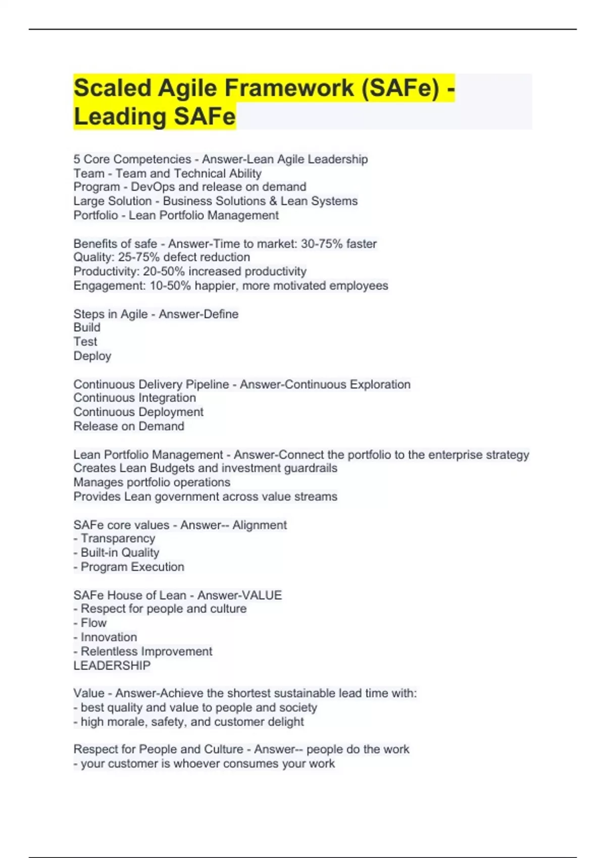 Scaled Agile Framework (SAFe) - Leading SAFe 5 Core Competencies - Answer-Lean Agile Leadership Team - Team and Technical Ability Program - DevOps and release on demand Large Solution - Business Solutions & Lean Systems Portfolio - Lean Portfolio Management Benefits of safe - Answer-Time to market: 30-75% faster Quality: 25-75% defect reduction Productivity: 20-50% increased productivity Engagement: 10-50% happier, more motivated employees Steps in Agile - Answer-Define Build Test Deploy Continuous Delivery Pipeline - Answer-Continuous Exploration Continuous Integration Continuous Deployment Release on Demand Lean Portfolio Management - Answer-Connect the portfolio to the enterprise strategy Creates Lean Budgets and investment guardrails Manages portfolio operations Provides Lean government across value streams SAFe core values - Answer-- Alignment - Transparency - Built-in Quality - Program Execution SAFe House of Lean - Answer-VALUE - Respect for people and culture - Flow - Innovation - Relentless Improvement LEADERSHIP Value - Answer-Achieve the shortest sustainable lead time with: - best quality and value to people and society - high morale, safety, and customer delight Respect for People and Culture - Answer-- people do the work - your customer is whoever consumes your work - build long term partnerships based on trust - cultural change comes last, not first - to change the culture, you have to change the organization Flow - Answer-- Optimize continuous and sustainable throughput of value - avoid start-stop-start project delays - Build quality in - Understand, exploit, and manage variability - Integrate frequently - Informed decision-making via fast feedback