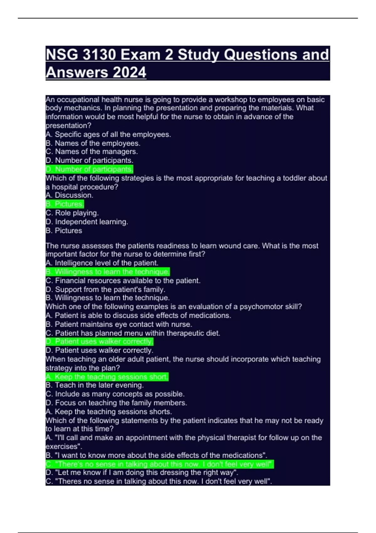 NSG 3130 Exam 2 Study Questions and Answers 2024