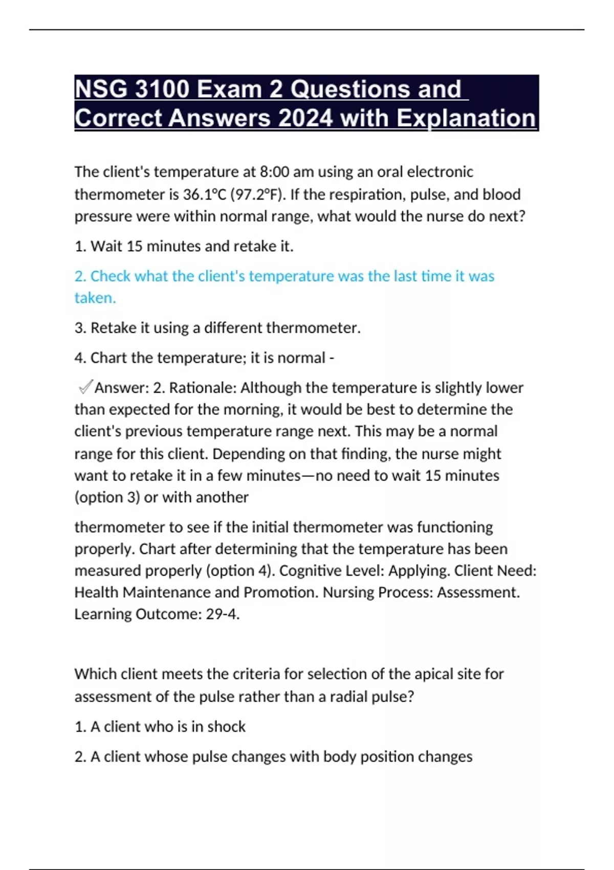 4. A client who had surgery less than 24 hours ago - ✔ Answer: 3. Rationale: The apical rate would confirm the rate and determine the actual cardiac rhythm for a client with an abnormal rhythm; a radial pulse would only reveal the heart rate and suggest an arrhythmia. For clients in shock, use the carotid or femoral pulse (option 1). The radial pulse is adequate for determining a change in the orthostatic heart rate (option 2). The radial pulse is appropriate for routine postoperative vital sign checks for clients with regular pulses (option 4). Cognitive Level: Understanding. Client Need: Health Promotion and Maintenance. Nursing Process: Planning. Learning Outcome: 29-5