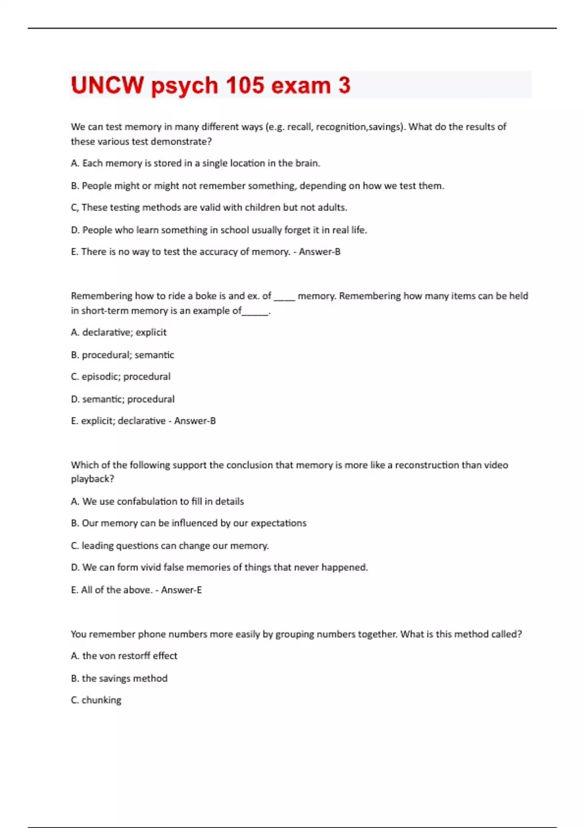 We can test memory in many different ways (e.g. recall, recognition,savings). What do the results of these various test demonstrate? A. Each memory is stored in a single location in the brain. B. People might or might not remember something, depending on how we test them. C, These testing methods are valid with children but not adults. D. People who learn something in school usually forget it in real life. E. There is no way to test the accuracy of memory. - Answer-B Remembering how to ride a boke is and ex. of ____ memory. Remembering how many items can be held in short-term memory is an example of_____. A. declarative; explicit B. procedural; semantic C. episodic; procedural D. semantic; procedural E. explicit; declarative - Answer-B Which of the following support the conclusion that memory is more like a reconstruction than video playback? A. We use confabulation to fill in details B. Our memory can be influenced by our expectations C. leading questions can change our memory. D. We can form vivid false memories of things that never happened. E. All of the above. - Answer-E You remember phone numbers more easily by grouping numbers together. What is this method called? A. the von restorff effect B. the savings method C. chunkingD. confabulation E. bit mapping - Answer-C This test question is an ex. of measuring memory using a ____ test. A. fee call B. cued recall C. recognition D. time savings E. procedural - Answer-C The Information Processing Model compares human memory to____. A. a car engine B. muscles C. a computer D. hydraulics E. tools - Answer-C Which of the following statements is NOT true regarding short term memory? A. short term memory lasts about 20 seconds without rehearsal B. short term memory is a limited capacity store C. information from short term mem can enter long term mem D. you cant do anything with the info in short term mem E. you can use chunking to increase the amount of info you can hold in short term mem - Answer-D Which of the following would you use the phonological loop for? A. rearranging furniture in your room B. imagining what vanilla ice cream tastes like. C. repeating your student ID number until youve memorized it D. remembering childhood addressE. recalling a flashbulb memory - Answer-C if you are having a hard time remembering info for this test bc u keep thinking about info on the previous test you may be experiencing what? A. proactive interference B. retroactive interference C. decay D. interruption E. Memory loss - Answer-A After a car accident, Robert cant remember the hours leading up to the accident. What kind of memory problem is he experiencing? A. anterograde amnesia B. a source-monitoring error C. retrograde amnesia D. state-dependent memory E. long term pontentiation - Answer-C Which type of thinking is quick, effortless, and uses mental shortcuts like heuristics and biases? A. automatic processing B. controlled processing C. bounded processing D. Rational processing E. irrational processing - Answer-A