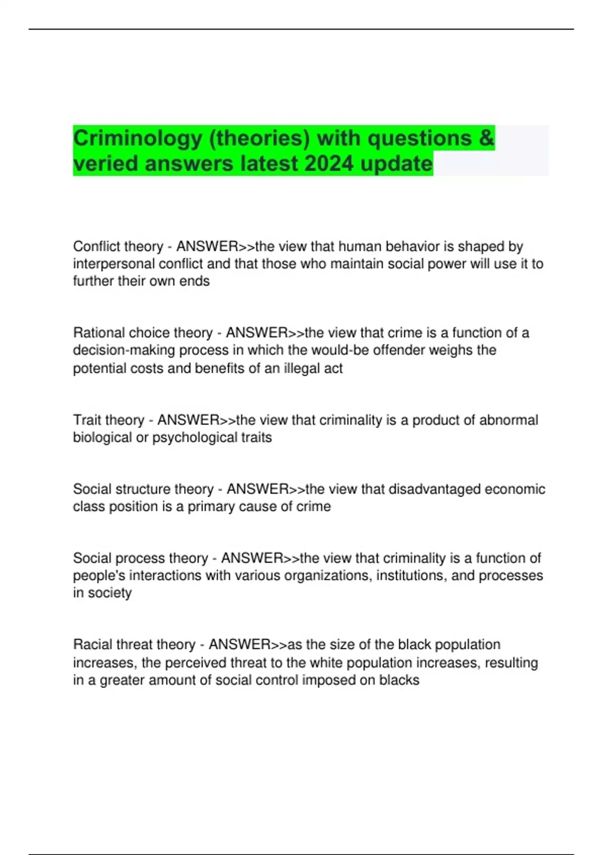 Criminology (theories) with questions & veried answers latest 2024 update Conflict theory - ANSWER>>the view that human behavior is shaped by interpersonal conflict and that those who maintain social power will use it to further their own ends Rational choice theory - ANSWER>>the view that crime is a function of a decision-making process in which the would-be offender weighs the potential costs and benefits of an illegal act Trait theory - ANSWER>>the view that criminality is a product of abnormal biological or psychological traits Social structure theory - ANSWER>>the view that disadvantaged economic class position is a primary cause of crime Social process theory - ANSWER>>the view that criminality is a function of people's interactions with various organizations, institutions, and processes in society Racial threat theory - ANSWER>>as the size of the black population increases, the perceived threat to the white population increases, resulting in a greater amount of social control imposed on blacks Victim precipitation theory - ANSWER>>the view that victims may initiate, either actively or passively, the confrontation that leads to their victimization Deviant place theory - ANSWER>>the view that victimization is primarily a function of where people live Routine activities theory - ANSWER>>the view that victimization results from the interaction of three everyday factors: the availability of suitable targets, the absence of capable guardians, and the presence of motivated offenders Arousal theory - ANSWER>>the view that people seek to maintain a preferred level of arousal but vary in how they process sensory input. A need for high levels of environmental stimulation may lead to aggressive, violent behavior patterns Psychodynamic theory - ANSWER>>theory, originated by Freud, that the human personality is controlled by unconscious mental processes that develop early in childhood and involve the interaction of id, ego, and superego Attachment theory - ANSWER>>Bowlby's theory that being able to form an emotional bond to another person is an important aspect of mental health throughout the life span Behavior theory - ANSWER>>the view that all human behavior is learned through a process of social reinforcement (rewards and punishment) Social learning theory - ANSWER>>the view that human behavior is modeled through observation of human social interactions, either directly