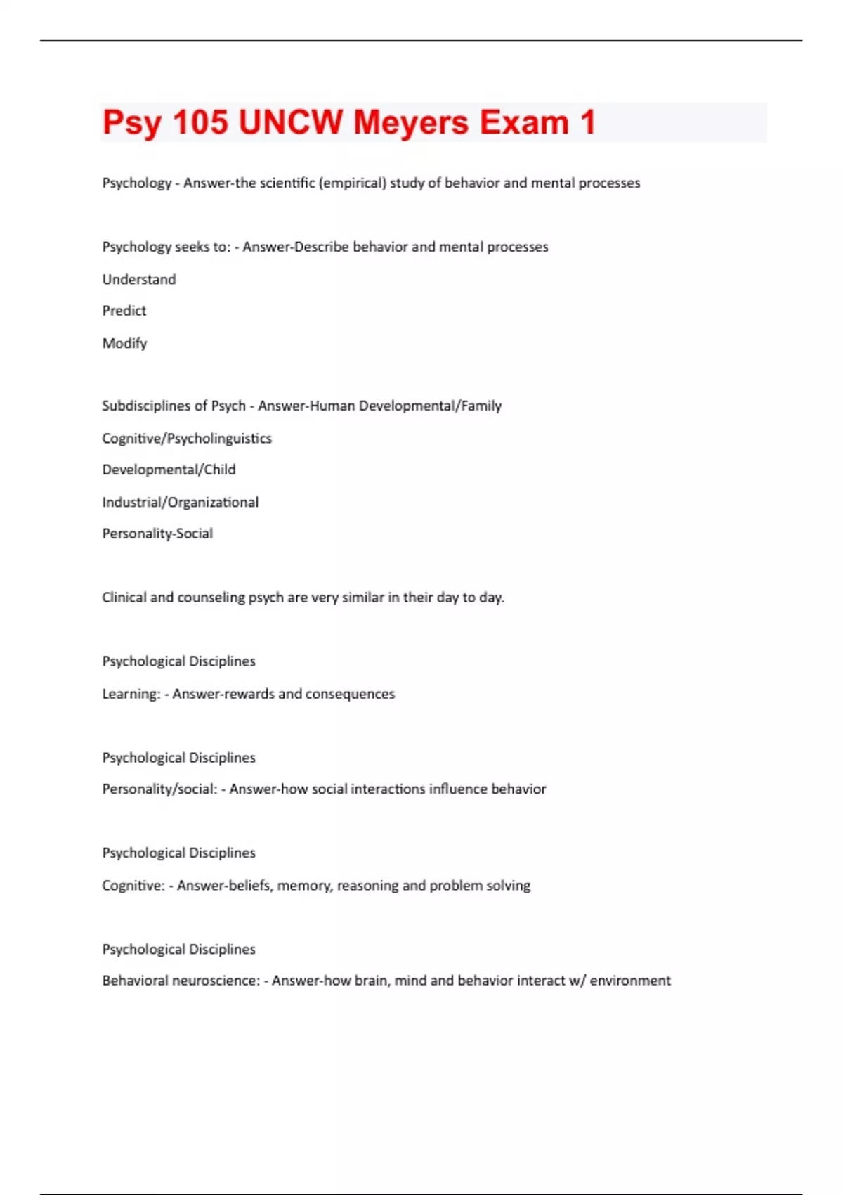 Psy 105 UNCW Meyers Exam 1 Questions And Answers | Updated Quiz | 100% Correct Answers
