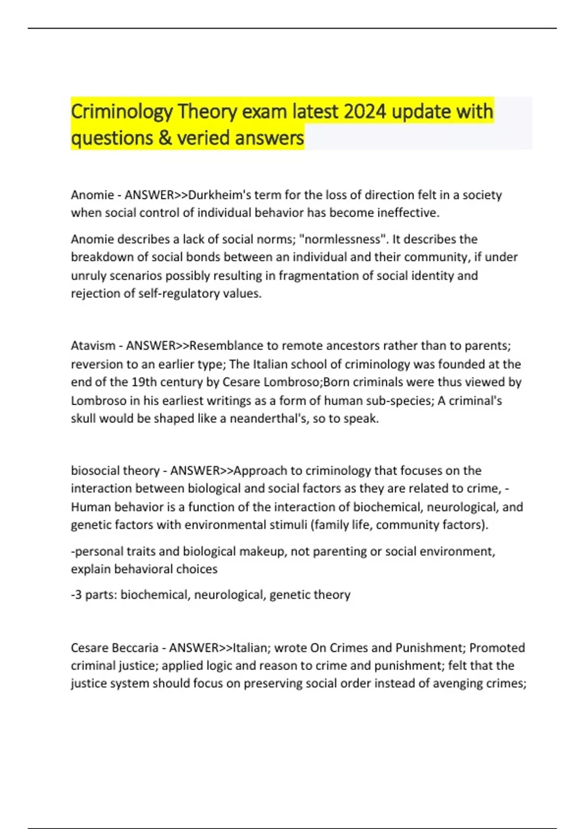 Criminology Theory exam latest 2024 update with questions & veried answers Anomie - ANSWER>>Durkheim's term for the loss of direction felt in a society when social control of individual behavior has become ineffective. Anomie describes a lack of social norms; "normlessness". It describes the breakdown of social bonds between an individual and their community, if under unruly scenarios possibly resulting in fragmentation of social identity and rejection of self-regulatory values. Atavism - ANSWER>>Resemblance to remote ancestors rather than to parents; reversion to an earlier type; The Italian school of criminology was founded at the end of the 19th century by Cesare Lombroso;Born criminals were thus viewed by Lombroso in his earliest writings as a form of human sub-species; A criminal's skull would be shaped like a neanderthal's, so to speak. biosocial theory - ANSWER>>Approach to criminology that focuses on the interaction between biological and social factors as they are related to crime, -Human behavior is a function of the interaction of biochemical, neurological, and genetic factors with environmental stimuli (family life, community factors). -personal traits and biological makeup, not parenting or social environment, explain behavioral choices -3 parts: biochemical, neurological, genetic theory Cesare Beccaria - ANSWER>>Italian; wrote On Crimes and Punishment; Promoted criminal justice; applied logic and reason to crime and punishment; felt that the justice system should focus on preserving social order instead of avenging crimes; called for the abolition of capital punishment and torture; wanted speedy trials and the elimination of cruel and unusual punishment; Cesare Lombroso - ANSWER>>An Italian doctor who published Criminal Man in which he argued that criminals are born biologically inferior and can be distinguished from noncriminal persons by the presence of certain physical characteristics or stigmata;, applied scientific method to the study of crime. believed criminals were biologically determined. theory of atavism Charles Darwin - ANSWER>>British Scientist; Social Darwinism in where letting nature take its course and not help the needy; also used by the Italian school to form theories of criminal being born and evolving into criminals; eliminating criminals from the gene pool was logical. Chicago School - ANSWER>>Criminological theories that rely, in part, on individuals' demographics and geographic location to explain criminal behavior; people's behaviors and personalities are shaped by their social and physical environments Classical School - ANSWER>>a criminological perspective of the late 1700s and early 1800s that had its roots in the enlightenment and that held that humans are rational beings, that crime is the result of the exercise of free will, and that punishment can be effective in reducing the incidence of crime, as it negates the pleasure to be derived from crime commission;punish to deter; all humans are rational Conflict Theory - ANSWER>>Conflict theories are perspectives in social science that emphasize the social, political, or material inequality of a social group; In Mills's view, social structures are created through conflict between people with differing interests and resources. Individuals and resources, in turn, are influenced by these structures and by the "unequal distribution of power and resources in the society. Conservative Ideology - ANSWER>>maintain peace through strength (military spending), supports troops, right to life, support prayer in schools, oppose affirmative action, favor free-market solutions, low taxes, low spending, go after the criminals, free gun control, less criminal rights Control Theories of Crime - ANSWER>>Social control theories of crime and delinquency attribute law-breaking to the weakness, breakdown, or absence of those social bonds or socialization processes that are presumed to encourage law-abiding conduct. Conventional Means - ANSWER>>governed very stringently by rules. socially accepted: conforming to socially accepted customs of behavior or style, especially in a way that lacks imagination Developmental Criminology - ANSWER>>Began during the 20th century (40's and 50's) An integration of sociological, psychological, and economic elements came together to form the perspective that criminality is a dynamic process influenced by social experiences as well as individual characteristics Differential Association - ANSWER>>An interpretation of the development of criminal behavior proposed by Edwin H. Sutherland, according to whom criminal behavior is learned through association with others who regularly engage in crime