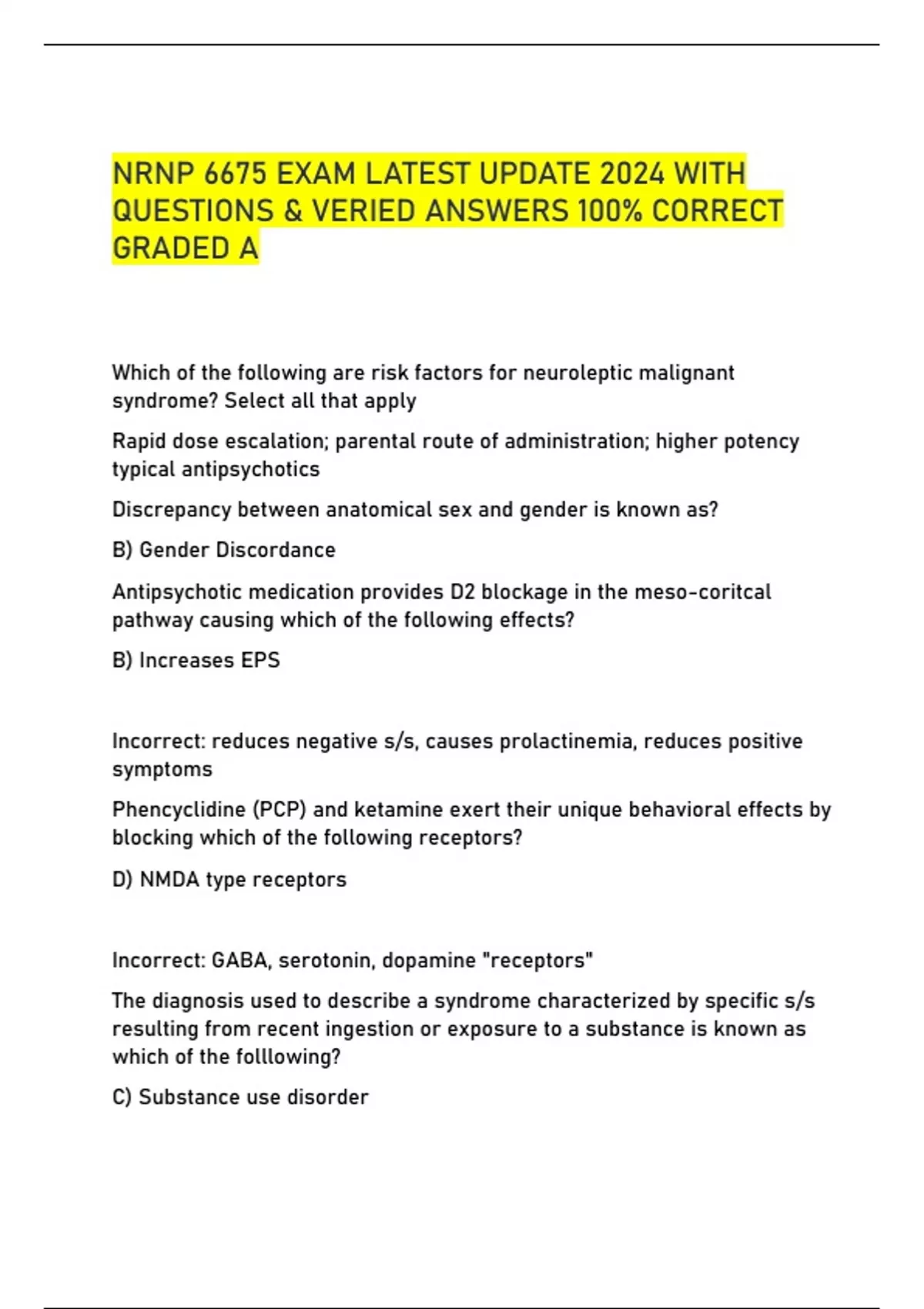 NRNP 6675 EXAM LATEST UPDATE 2024 WITH QUESTIONS & VERIED ANSWERS 100% CORRECT GRADED A Which of the following are risk factors for neuroleptic malignant syndrome? Select all that apply Rapid dose escalation; parental route of administration; higher potency typical antipsychotics Discrepancy between anatomical sex and gender is known as? B) Gender Discordance Antipsychotic medication provides D2 blockage in the meso-coritcal pathway causing which of the following effects? B) Increases EPS Incorrect: reduces negative s/s, causes prolactinemia, reduces positive symptoms Phencyclidine (PCP) and ketamine exert their unique behavioral effects by blocking which of the following receptors? D) NMDA type receptors Incorrect: GABA, serotonin, dopamine "receptors" The diagnosis used to describe a syndrome characterized by specific s/s resulting from recent ingestion or exposure to a substance is known as which of the folllowing? C) Substance use disorder Incorrect: substance intox, substance withdrawal, all of the above Abnormal involuntary movements in a rhythmic pattern affecting the face, mouth, tongue jaw is known as which of the following? C) Tardive dyskinesia Incorrect: akathisia, dystonia, EPS A deeply held belief despite evidence to the contrary, lasting at least 1 month, without prominent hallucinations, with functional impairment that relates to the delusional system disorder called? Delusional disorder Which of the following is true about preoccupation with castration? A) This can be serious and life threatening if castration is carried out without medical supervision Incorrect: consistent with transvestiatic disorder, other specified paraphillic disorder, or sexual machochism disorder Which of the following is a system that provides a uniform language for describing medical and surgical procedures and diagnostics services rendered by clinicians? CPT Incorrect: HIPPA, DSM5-, DRG A patient on Chlorpromazine states his orgasm is dry and afterwards he will commonly have milky urine. The APRN realizes this is which of the following? A) This is likely a harmless response to the Chlorpromazine "Thorazine" A condition which results from absence of second female sex chromosome (XO) and is associated with web neck, dwarfism, cubitus valgus and infertility is known as which of the following? B) Turners Syndrome Turners syndrome: tx involves hormone therapy; fertility treatments for women when they decide to have a baby Which of the following would be characterized as a negative s/s of schizophrenia? B & C only B) impaired social and occupational functioning C) isolation and impaired self-care Which of the following are keys to distinguishing OCD from psychosis? Patients with OCD can almost always acknowledge the unreasonable nature of their symptoms A federal program administered nationally and locally which covers enrolled individuals 65+ who pays premiums and disabled individuals Both A& B (Medicare and Medicaid) Having an adequate legal description of nurse practitioner (NP) scope of practice according to state law is important for which of the following reasons? All of the above (to avoid any charges of practicing medicine without a license, to place accountability for both benefits and harm to patients squarely on the NP, to get reimbursed for physician services when provided by a NP Which of the following is the most widely consumed psychoactive substance? B) Caffeine Incorrect: alcohol, heroin, cannabis Which of the following is used to tx TD? None of the above (cogentin, artane, catapress) The APRN consensus model did which of the following? B & C B) adult and gerontology were merged and identified as PCP or acute care C) psychiatric mental health foci were stipulated as across the lifespan Which of the following behaviors are associated with an alcohol blood level of 0.05%? B) Thought judgement and restraints are impaired According to HIPPA, which of the following must the NP share their NPI with? Check all the above A) Health Plans B) Other providers C) Any entity that may need it for a billing purpose
