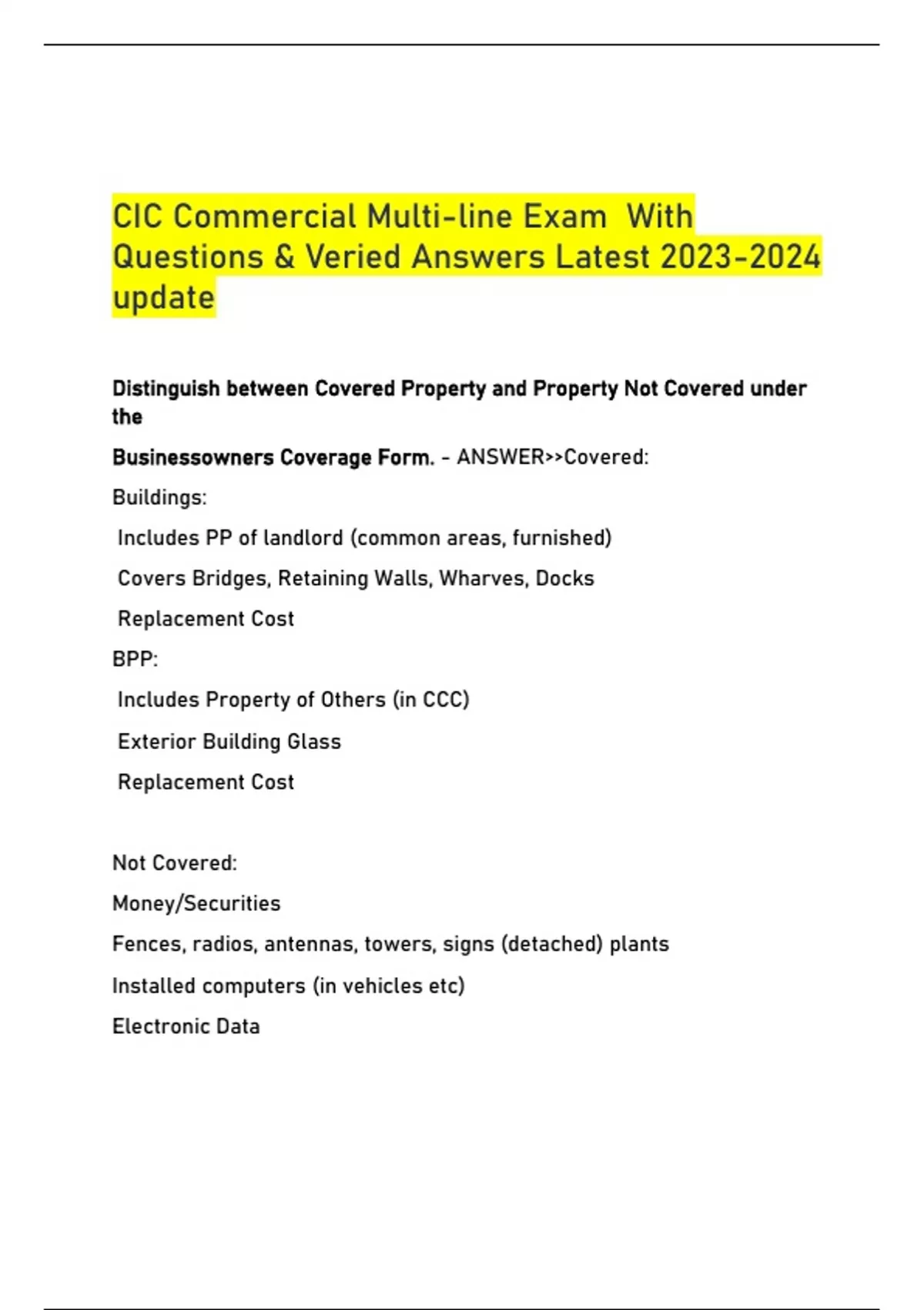 IC Commercial Multi-line Exam With Questions & Veried Answers Latest update Distinguish between Covered Property and Property Not Covered under the Businessowners Coverage Form. - ANSWER>>Covered: Buildings: Includes PP of landlord (common areas, furnished) Covers Bridges, Retaining Walls, Wharves, Docks Replacement Cost BPP: Includes Property of Others (in CCC) Exterior Building Glass Replacement Cost Not Covered: Money/Securities Fences, radios, antennas, towers, signs (detached) plants Installed computers (in vehicles etc) Electronic Data Identify and describe the Additional Coverages, Coverage Extensions, and Limits Of Insurance of the Businessowners Policy. - ANSWER>>Additional Coverages: Fire Department ($2.5k) B.I.- 12 mo ALS, 72 hr Waiting period payroll 60 days covers normal operating expenses triggered by suspension (slowdown, cessation, premises is untenable) by covered loss Extra Expense- No waiting period, 12 mo. pays additional cost while operations are disrupted Civil Authority- if authority shuts you down- 4 wks 72 hr waiting (BI/EE) Money Orders & Conterfit money: $1k Forgery or Alterations Increased Cost of Construction BI from dependent properties Fire Extingushers Electronic Data Interruption of Computer Operations COVERAGE EXTENSIONS Newly acquired or construction property (30 days to tell) Personal Property Off Premises ($10k in transit, no money) Outdoor Property (2.5k plants, fence, sign FLARE Perils only) Personal Effects Valuable Papers Accts Recivables BPP in Temp storage units LIMITS of insurance attached sign- $1k Inflation Guard- AUtomatic building increase BPP Seasonal Increase (25%) Identify and describe the property Optional Coverages available in the BOP that must be activated in order for coverage to apple - ANSWER>>Outdoor Signs: $1k attached, $2.5k Detached Money & Securities: Theft, disappearance or destruction Employee Dishonesty Equipment Breakdown MUST BE ACTIVATED FOR COVERAGE TO APPLY BY X ON DEC PAGE Identify the two promises the insurer makes in the Business Liability insuring agreement and state the requirements that must be met for coverage to apply - ANSWER>>1.) Insurer agrees to pay the sums of BI/PD that the insured is legally liable to pay 2.) Insurer has the right and duty to defend the insured in the event of a loss Summarize the advantages and disadvantages of the BOP - ANSWER>>Advantages: -No Coinsurance -Replacement Cost Building + BPP -Automatic Building Increase (inflation) -Automatic Seasonal Increase BPP -BI, 12 mo ALS