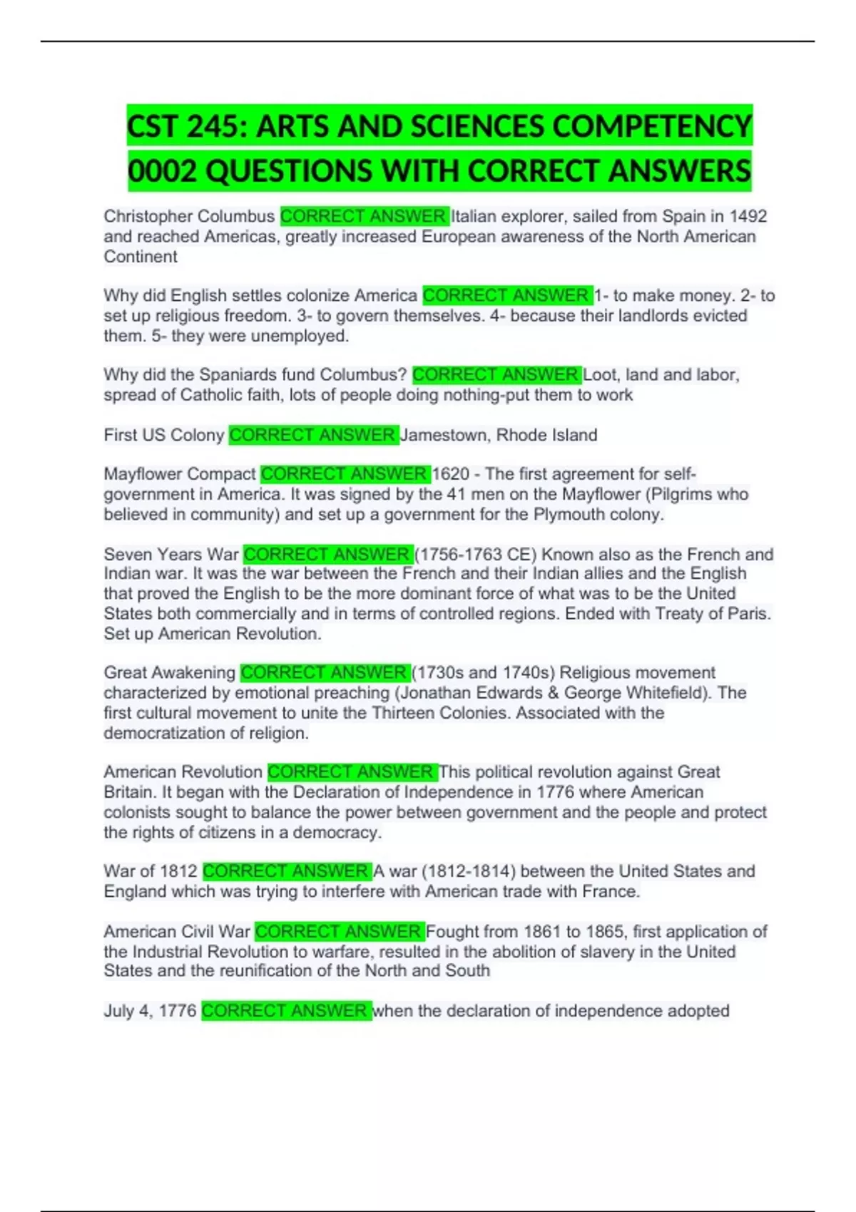 CST 245: ARTS AND SCIENCES COMPETENCY 0002 QUESTIONS WITH CORRECT ANSWERS Christopher Columbus CORRECT ANSWER Italian explorer, sailed from Spain in 1492 and reached Americas, greatly increased European awareness of the North American Continent Why did English settles colonize America CORRECT ANSWER 1- to make money. 2- to set up religious freedom. 3- to govern themselves. 4- because their landlords evicted them. 5- they were unemployed. Why did the Spaniards fund Columbus? CORRECT ANSWER Loot, land and labor, spread of Catholic faith, lots of people doing nothing-put them to work First US Colony CORRECT ANSWER Jamestown, Rhode Island Mayflower Compact CORRECT ANSWER 1620 - The first agreement for self-government in America. It was signed by the 41 men on the Mayflower (Pilgrims who believed in community) and set up a government for the Plymouth colony. Seven Years War CORRECT ANSWER ( CE) Known also as the French and Indian war. It was the war between the French and their Indian allies and the English that proved the English to be the more dominant force of what was to be the United States both commercially and in terms of controlled regions. Ended with Treaty of Paris. Set up American Revolution. Great Awakening CORRECT ANSWER (1730s and 1740s) Religious movement characterized by emotional preaching (Jonathan Edwards & George Whitefield). The first cultural movement to unite the Thirteen Colonies. Associated with the democratization of religion.
