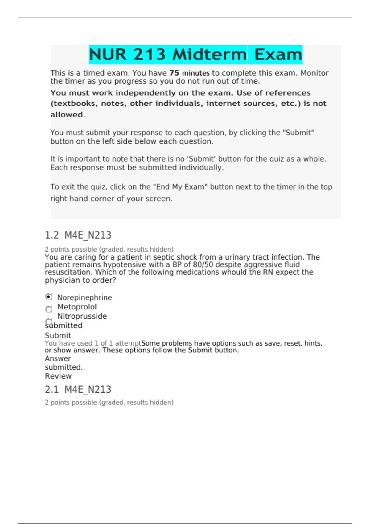 NUR 213 Midterm Exam This is a timed exam. You have 75 minutes to complete this exam. Monitor the timer as you progress so you do not run out of time. You must work independently on the exam. Use of references (textbooks, notes, other individuals, internet sources, etc.) is not allowed.