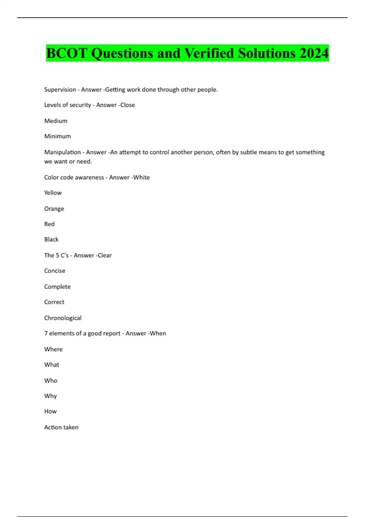 BCOT Questions and Verified Solutions 2024 Supervision - Answer -Getting work done through other people. Levels of security - Answer -Close Medium Minimum Manipulation - Answer -An attempt to control another person, often by subtle means to get something we want or need. Color code awareness - Answer -White Yellow Orange Red Black The 5 C's - Answer -Clear Concise Complete