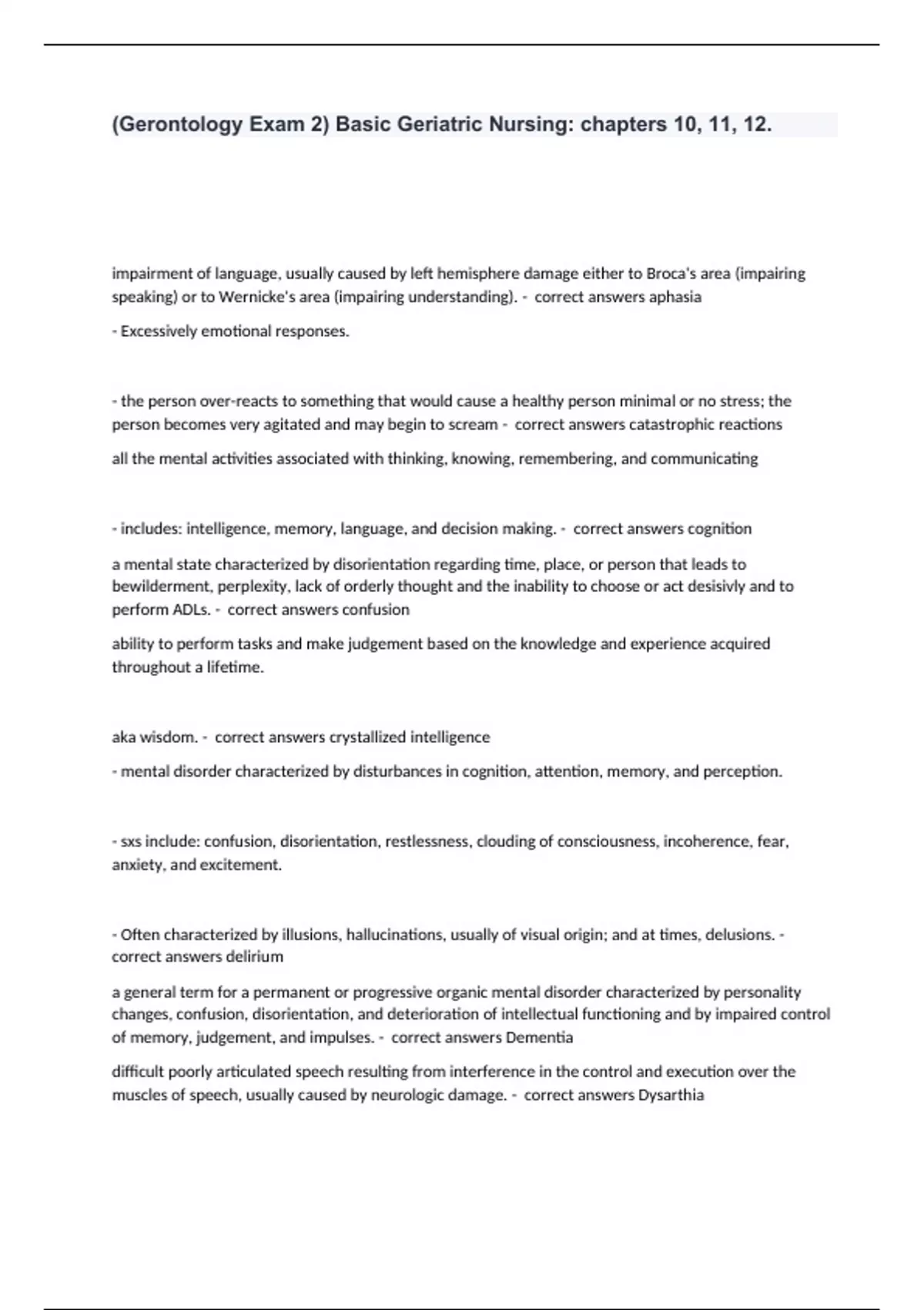 (Gerontology Exam 2) Basic Geriatric Nursing: chapters 10, 11, 12. impairment of language, usually caused by left hemisphere damage either to Broca's area (impairing speaking) or to Wernicke's area (impairing understanding). - correct answers aphasia - Excessively emotional responses. - the person over-reacts to something that would cause a healthy person minimal or no stress; the person becomes very agitated and may begin to scream - correct answers catastrophic reactions all the mental activities associated with thinking, knowing, remembering, and communicating - includes: intelligence, memory, language, and decision making. - correct answers cognition a mental state characterized by disorientation regarding time, place, or person that leads to bewilderment, perplexity, lack of orderly thought and the inability to choose or act desisivly and to perform ADLs. - correct answers confusion ability to perform tasks and make judgement based on the knowledge and experience acquired throughout a lifetime. aka wisdom. - correct answers crystallized intelligence - mental disorder characterized by disturbances in cognition, attention, memory, and perception. - sxs include: confusion, disorientation, restlessness, clouding of consciousness, incoherence, fear, anxiety, and excitement. - Often characterized by illusions, hallucinations, usually of visual origin; and at times, delusions. - correct answers delirium a general term for a permanent or progressive organic mental disorder characterized by personality changes, confusion, disorientation, and deterioration of intellectual functioning and by impaired control of memory, judgement, and impulses. - correct answers Dementia difficult poorly articulated speech resulting from interference in the control and execution over the muscles of speech, usually caused by neurologic damage. - correct answers Dysarthia difficulty swallowing - correct answers dysphagia aka aphasia - correct answers dysphasia vision loss in half of the visual field of one or both eyes - correct answers hemianopsia the potential ability and capacity to acquire, retain, and apply experience, understanding, knowledge, reasoning, and judgement in coping with new experiences and solving problems. - correct answers intelligence the mental faculty or power that enables one to retain and recall, through unconscious associative processes, previously experienced sensations, impressions, ideas, concepts, and all information that has been consciously learned. - correct answers memory hereditary condition of the bony labyrinth of the ear in which there is formation of spongy bone, resulting in hearing loss. - correct answers otosclerosis the conscious recognition and interpretation of sensory stimuli that serve as a basis for understanding, learning, and knowing, or for motivating a particular action or reaction. - correct answers Perception Found in older people, farsightedness resulting from a loss of elasticity of the lens of the eye and resulting in a decrease in the power of accommodation. - correct answers presbyopia Things that excite or incite an organism or part to function, become active, or respond. - correct answers Stimuli A condition in which persons with cognitive impairment (e.g., people with Alzheimer disease) and older people tend to become confused or disorientated at the end of the day, exhibiting such behaviors as wandering, combativeness, suspiciousness, hallucinations, and delusions. - correct answers sundowning syndrome 1. Environment excites/stimulates the senses. 2. Senses pass the stimuli to the cerebral cortex where recognition (perception) and interpretation (cognition) occur. - Specific regions of the cerebral cortex are responsible for detecting and processing stimuli acquired by var senses. - Malfunction of the sensory organs or the interpretation centers in the brain results in distributed perception and cognition. - correct answers Describe normal sensory and cognitive function. (chapter 10) - Visual changes: farsightedness (caused by presbyopia), decreased ability to respond to changes in light which result in night blindness, cataracts (cloud the lens and glare sensitivity). - Auditory changes: loss of hearing acuity particularly of higher pitch sounds (presbycusis), loss of hearing from decreased sound transmission (otosclerosis), and ringing in the ears (tinnitus) which can be caused by Meniere's disease or age-related changes or even medications. older adults are increasing susceptible to misperception and therefore misinterpretation when one or