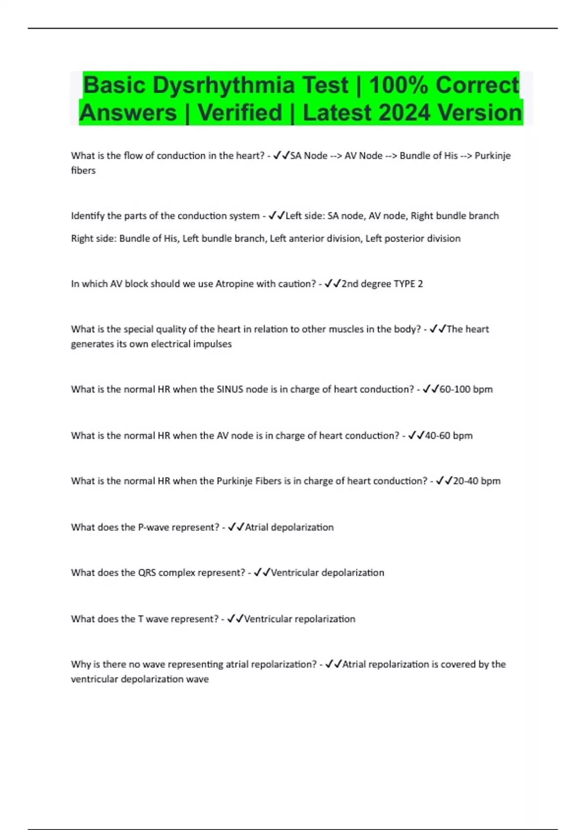 Basic Dysrhythmia Test | 100% Correct Answers | Verified | Latest 2024 Version What is the flow of conduction in the heart? - SA Node --> AV Node --> Bundle of His --> Purkinje fibers Identify the parts of the conduction system - Left side: SA node, AV node, Right bundle branch Right side: Bundle of His, Left bundle branch, Left anterior division, Left posterior division In which AV block should we use Atropine with caution? - 2nd degree TYPE 2 What is the special quality of the heart in relation to other muscles in the body? - The heart generates its own electrical impulses What is the normal HR when the SINUS node is in charge of heart conduction? - 60-100 bpm What is the normal HR when the AV node is in charge of heart conduction? - 40-60 bpm What is the normal HR when the Purkinje Fibers is in charge of heart conduction? - 20-40 bpm What does the P-wave represent? - Atrial depolarization What does the QRS complex represent? - Ventricular depolarization What does the T wave represent? - Ventricular repolarization Why is there no wave representing atrial repolarization? - Atrial repolarization is covered by the ventricular depolarization wave What is the danger of a prolonged QT interval? - Mailed to types of ventricular tachycardia One small box - 0.04 seconds One large box - 0.20 seconds (5 tiny boxes) Normal PR interval - 0.12-0.20 seconds Normal QRS complex - 0.04-0.10 seconds Normal QT interval - Less than 0.46 seconds J Point - Junction between end of QRS complex and start of T wave To measure ST segment - Begin one small square past J point 5 Critical Rhythms - Ventricular Fibrillation Ventricular Tachycardia Asystole 3rd Degree AV block ST elevation General Interventions - Always assess the patient first RRT and PCP or Code 12-lead EKG Cardiac enzymes Patent IV Initial Interventions for ST elevation - M: morphine O: oxygen N: nitroglycerin A: aspirin - prepare for Cath lab 6 Basic Steps for Rhythm Interpretation - HR Rhythm P-wave P-R interval QRS width Other findings