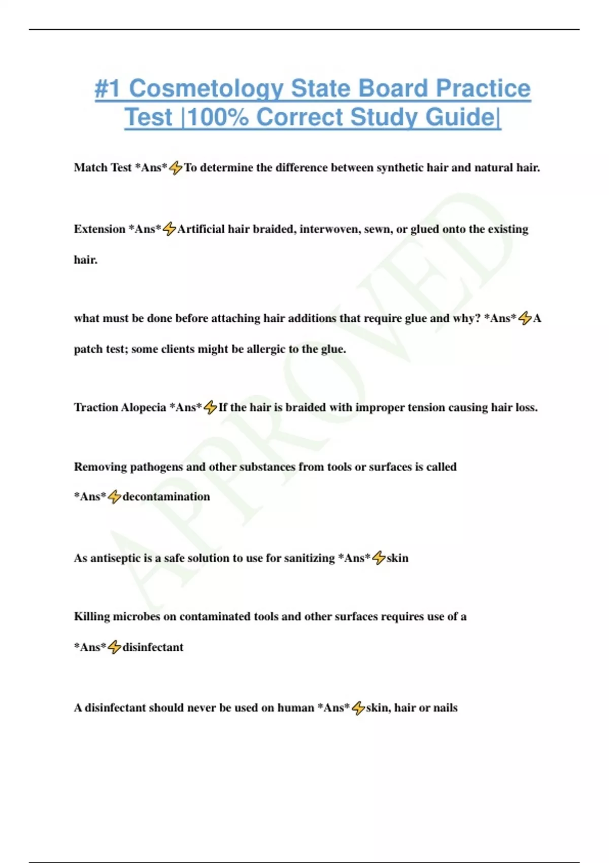 #1 Cosmetology State Board Practice Test |100% Correct Study Guide| Match Test *Ans* To determine the difference between synthetic hair and natural hair. Extension *Ans* Artificial hair braided, interwoven, sewn, or glued onto the existing hair. what must be done before attaching hair additions that require glue and why? *Ans* A patch test; some clients might be allergic to the glue. Traction Alopecia *Ans* If the hair is braided with improper tension causing hair loss. Removing pathogens and other substances from tools or surfaces is called *Ans* decontamination As antiseptic is a safe solution to use for sanitizing *Ans* skin Killing microbes on contaminated tools and other surfaces requires use of a *Ans* disinfectant A disinfectant should never be used on human *Ans* skin, hair or nails The federal government agency
