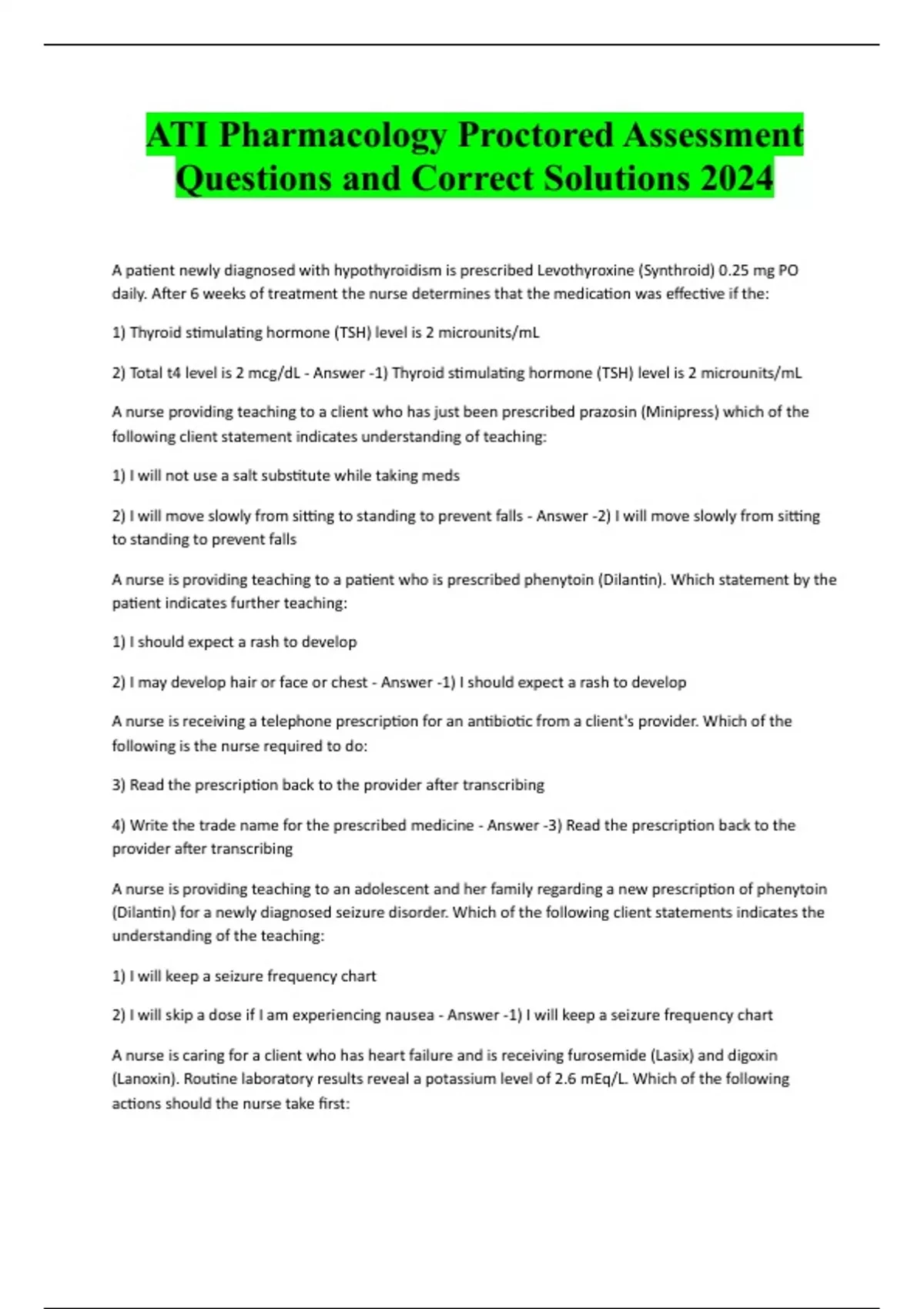ATI Pharmacology Proctored Assessment Questions and Correct Solutions 2024 A patient newly diagnosed with hypothyroidism is prescribed Levothyroxine (Synthroid) 0.25 mg PO daily. After 6 weeks of treatment the nurse determines that the medication was effective if the: 1) Thyroid stimulating hormone (TSH) level is 2 microunits/mL 2) Total t4 level is 2 mcg/dL - Answer -1) Thyroid stimulating hormone (TSH) level is 2 microunits/mL A nurse providing teaching to a client who has just been prescribed prazosin (Minipress) which of the following client statement indicates understanding of teaching: 1) I will not use a salt substitute while taking meds 2) I will move slowly from sitting to standing to prevent falls - Answer -2) I will move slowly from sitting to standing to prevent falls A nurse is providing teaching to a patient who is prescribed phenytoin (Dilantin). Which statement by the patient indicates further teaching: 1) I should expect a rash to develop 2) I may develop hair or face or chest - Answer -1) I should expect a rash to develop A nurse is receiving a telephone prescription for an antibiotic from a client's provider. Which of the following is the nurse required to do: 3) Read the prescription back to the provider after transcribing 4) Write the trade name for the prescribed medicine - Answer -3) Read the prescription back to the provider after transcribing A nurse is providing teaching to an adolescent and her family regarding a new prescription of phenytoin (Dilantin) for a newly diagnosed seizure disorder. Which of the following client statements indicates the understanding of the teaching: 1) I will keep a seizure frequency chart 2) I will skip a dose if I am experiencing nausea - Answer -1) I will keep a seizure frequency chart A nurse is caring for a client who has heart failure and is receiving furosemide (Lasix) and digoxin (Lanoxin). Routine laboratory results reveal a potassium level of 2.6 mEq/L. Which of the following actions should the nurse take first: