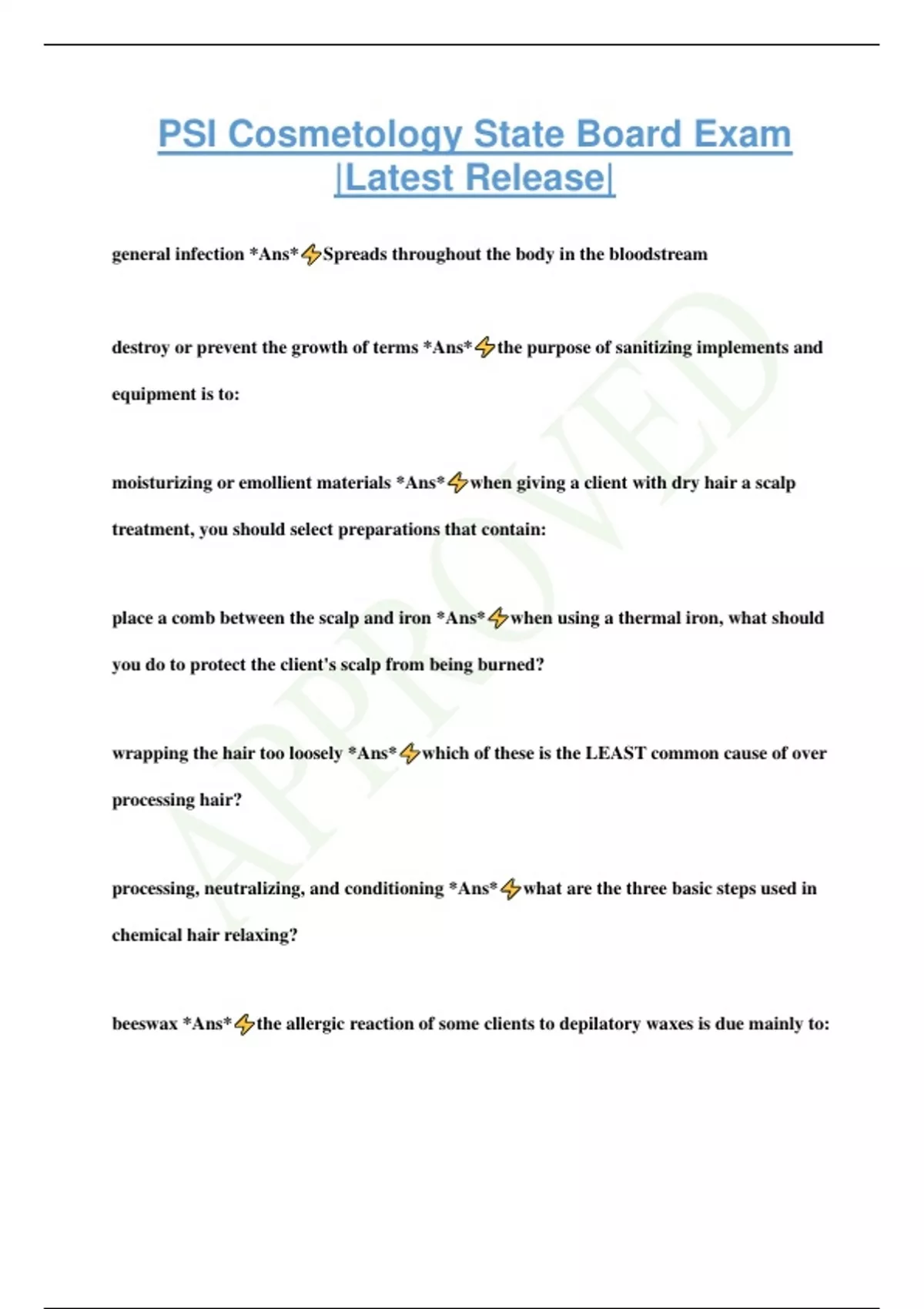 PSI Cosmetology State Board Exam |Latest Release| general infection *Ans* Spreads throughout the body in the bloodstream destroy or prevent the growth of terms *Ans* the purpose of sanitizing implements and equipment is to: moisturizing or emollient materials *Ans* when giving a client with dry hair a scalp treatment, you should select preparations that contain: place a comb between the scalp and iron *Ans* when using a thermal iron, what should you do to protect the client's scalp from being burned? wrapping the hair too loosely *Ans* which of these is the LEAST common cause of over processing hair? processing, neutralizing, and conditioning *Ans* what are the three basic steps used in chemical hair relaxing? beeswax *Ans* the allergic reaction of some clients to depilatory waxes is due mainly to: produce muscular contractions *Ans* the use of a mechanical vibrator during a massage will: after the completion of each client *Ans* cleanup of the manicure table should be done: a mending adhesive *Ans* in a nail wrap, the wrapping material is applied with: gauze *Ans* what can be used to hold in place certain mask ingredients that tend to run? consultation *Ans* all facial treatments should start with a: massage *Ans* manual or mechanical manipulation of the body clay based *Ans* a mask used for oily skin for absorbing cream *Ans* a mask that doesn't dry on skin but is used for dry skin exfoliation *Ans* removal of excess dead cells from the skin surface moisturizer *Ans* the product used